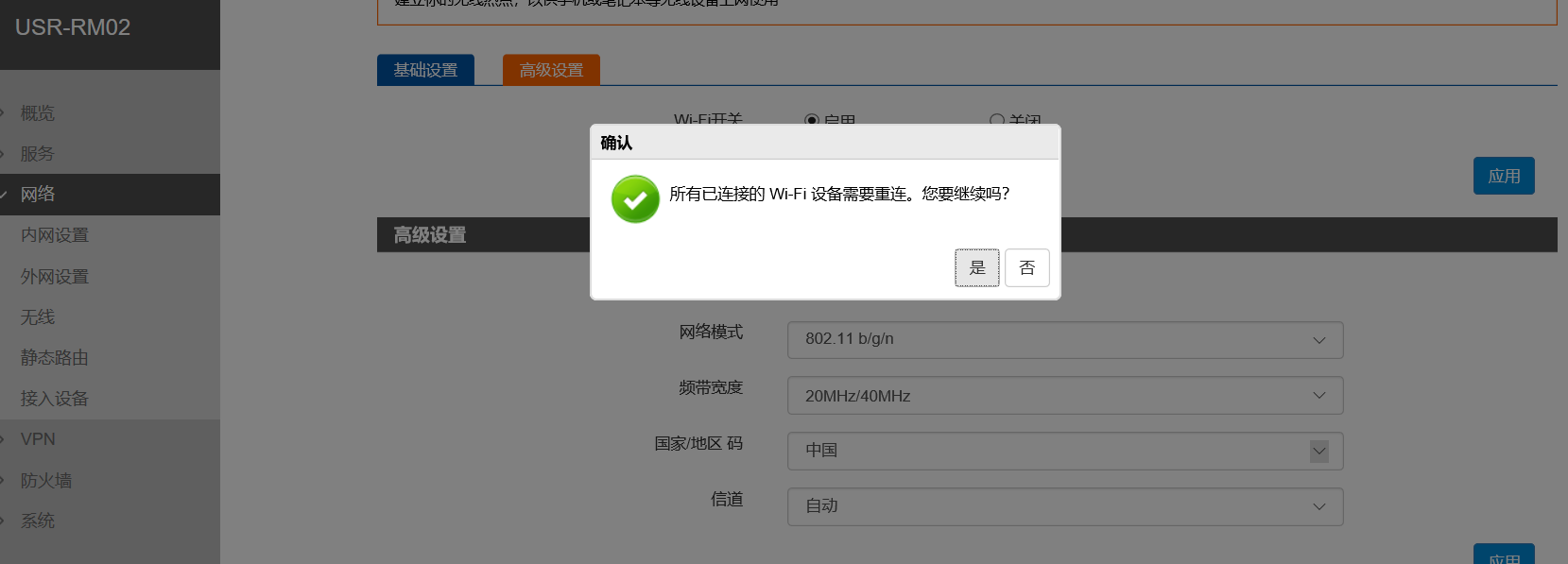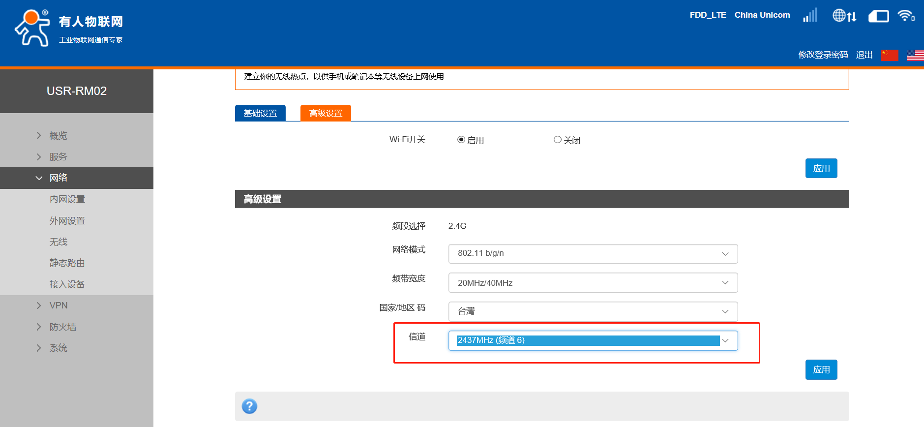 2、如果WiFi信号不好,天线也都接对了,可以修改一个当地比较干净的信道,之后点击应用。