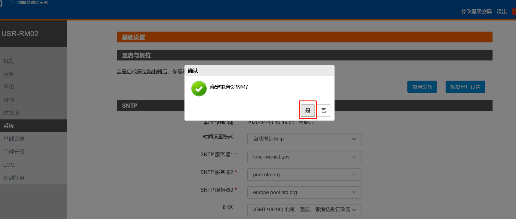 3、设置完参数后点击系统--基础设置--重启设备。