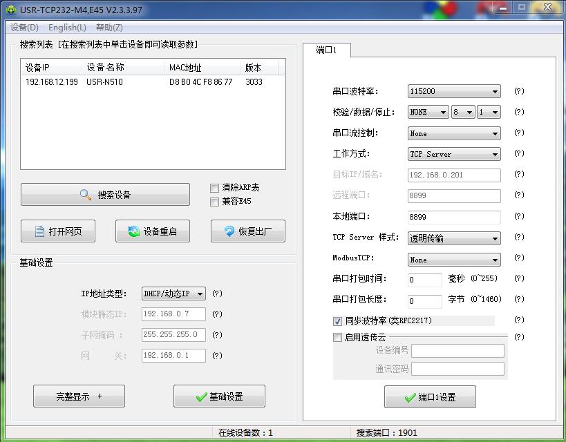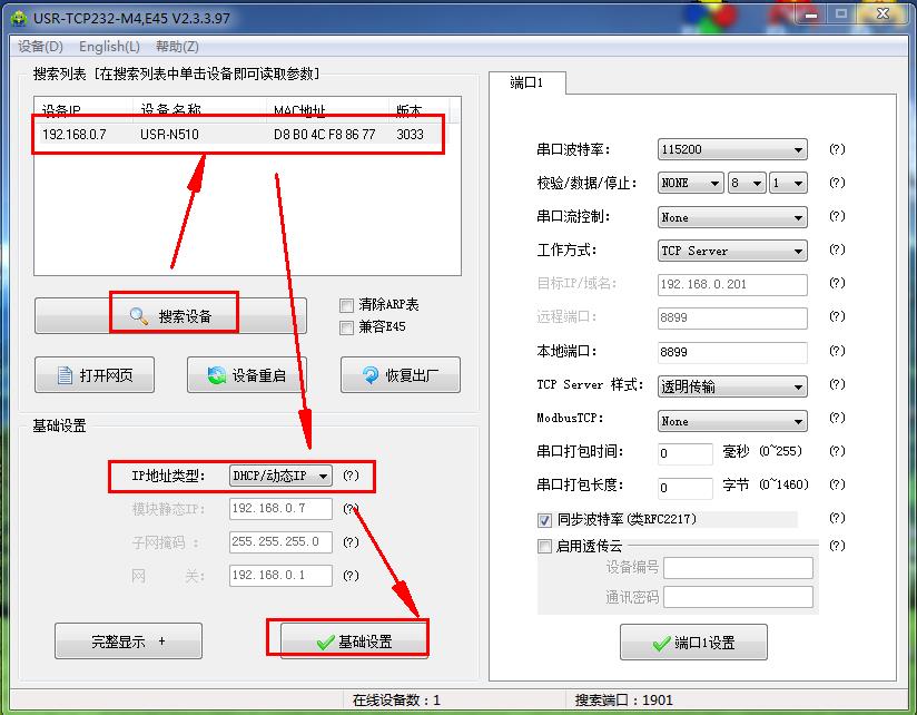 用M4设置软件搜索USR-N510的Ip,192.168.0.7,USR-N510用串口设置软件设置DHCp,动态获取Ip。