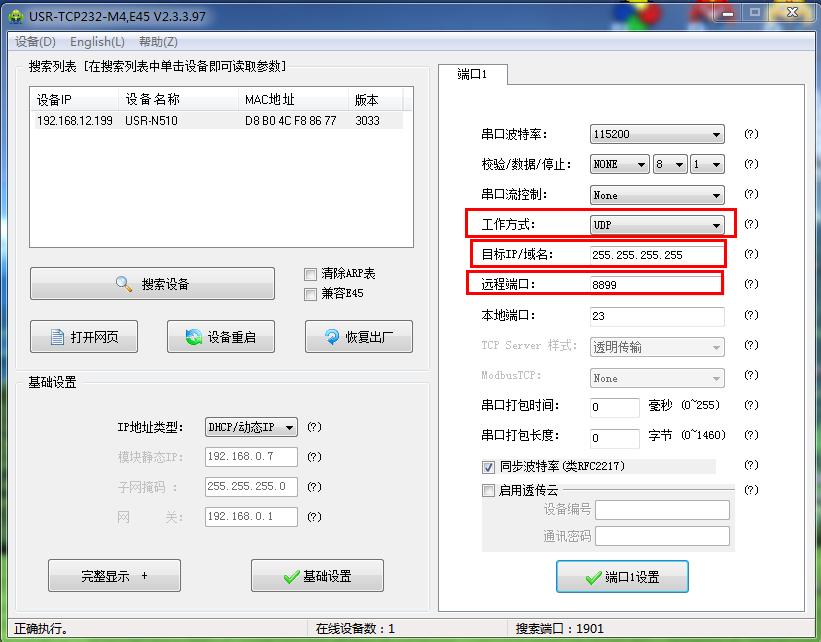 N510网口用网线接路由器,电脑也连接同一个路由器。用M4设置软件搜索USR-N510的Ip 192.168.12.199