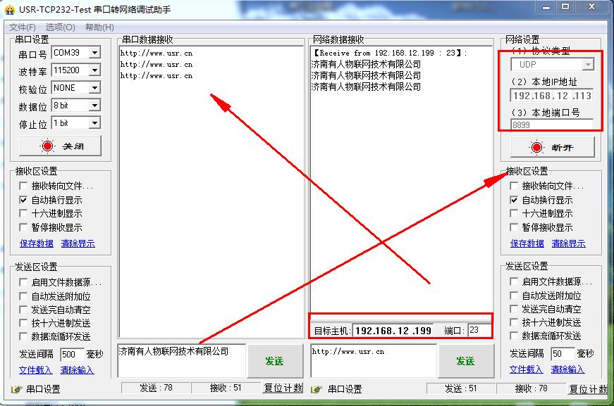 在电脑下载,并安装打开USR-TCp232-TEST 串口网络助手。建立UDp连接,就可以实现N510串口和网络之间数据传输。