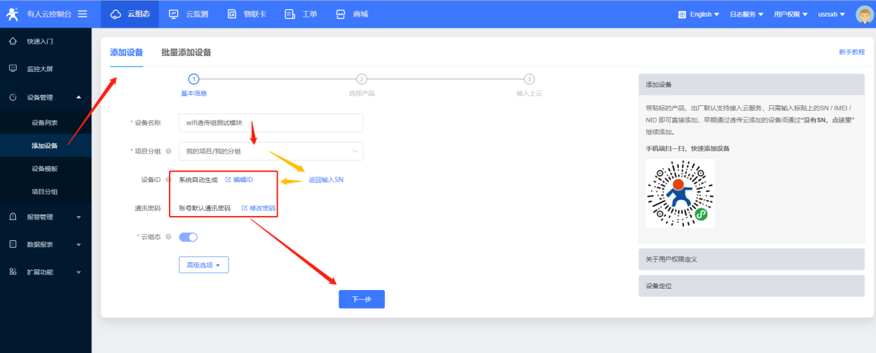 6、添加设备时,自定义设备名称“wifi透传组测试模块”,模块目前只能使用ID方式添加设备id,不能直接使用SN码添加设备, 点击“没有SN,点这里”,使用设备id和密码默认添加就可以,点击一下步。