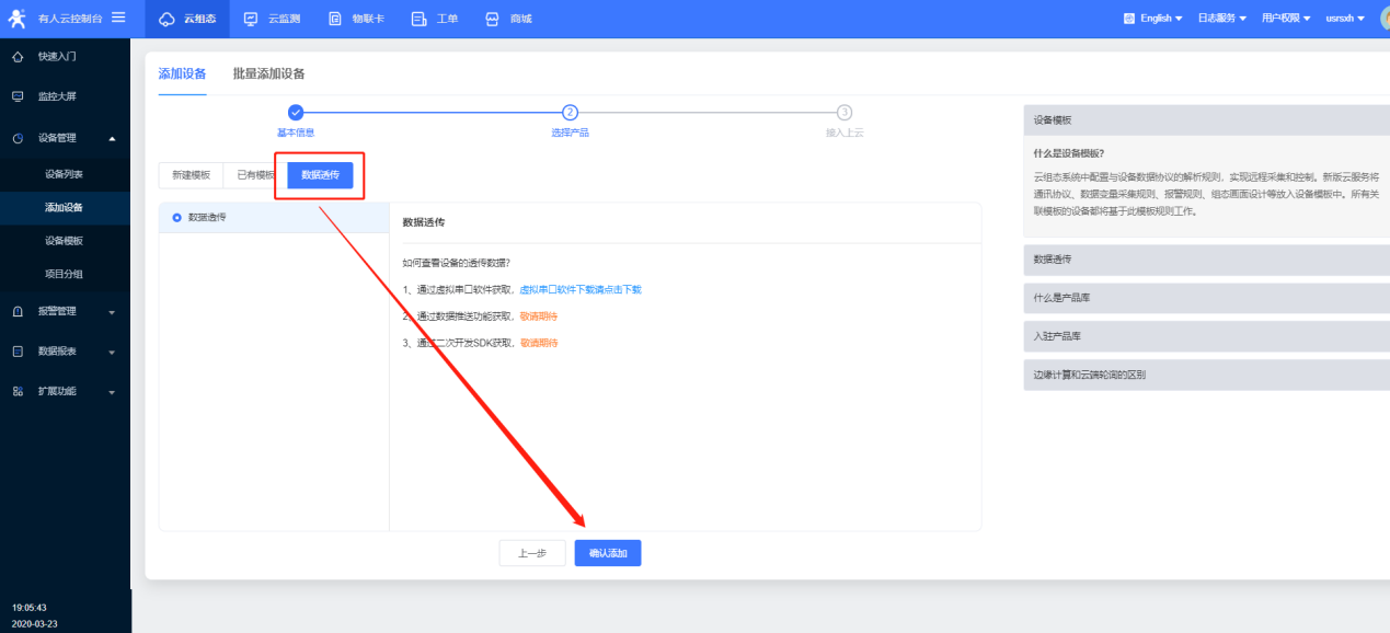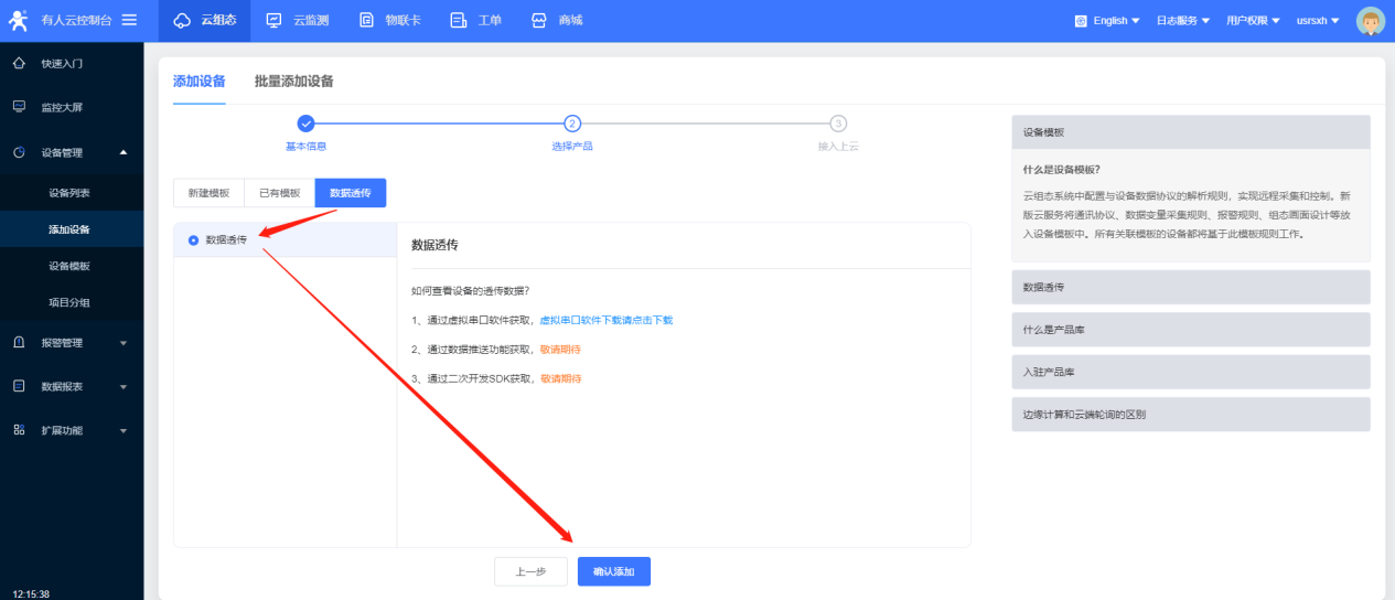 9、再次添加设备,名称设置“wifi透传组测试模块2”,设备ID与通信密码自动生成后点击“下一步”后,选择“数据透传”,确认添加。