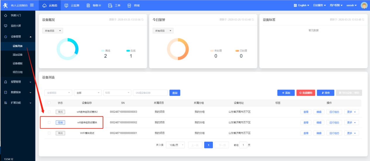 16、依据第11~15步,让第二个wifi模块入网,第二个模块的设备ID与通讯密码填写位透传云模块2的SN与密码,配置完模块重启, 第二个模块在云端显示上线。