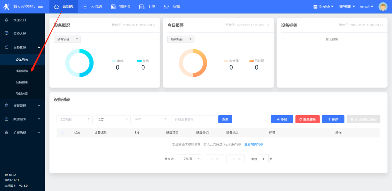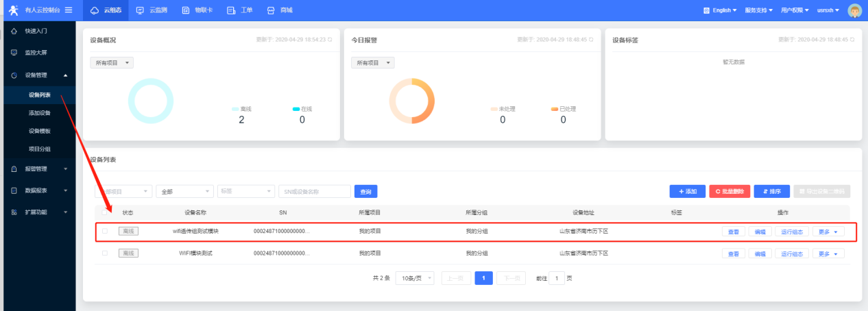 5、本次案例是C215连有人云进行数据显示,可以进入云组态,选择添加设备。
