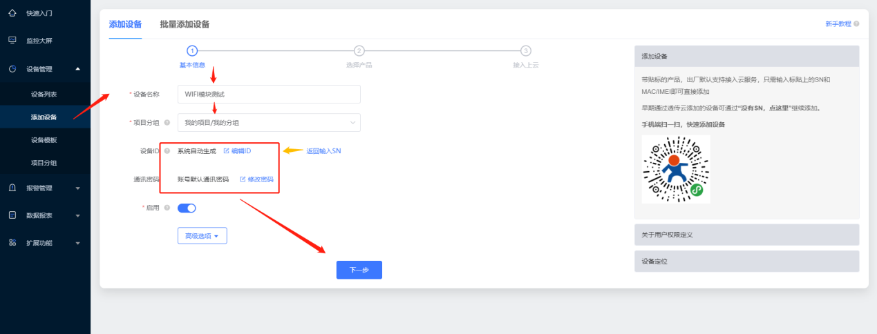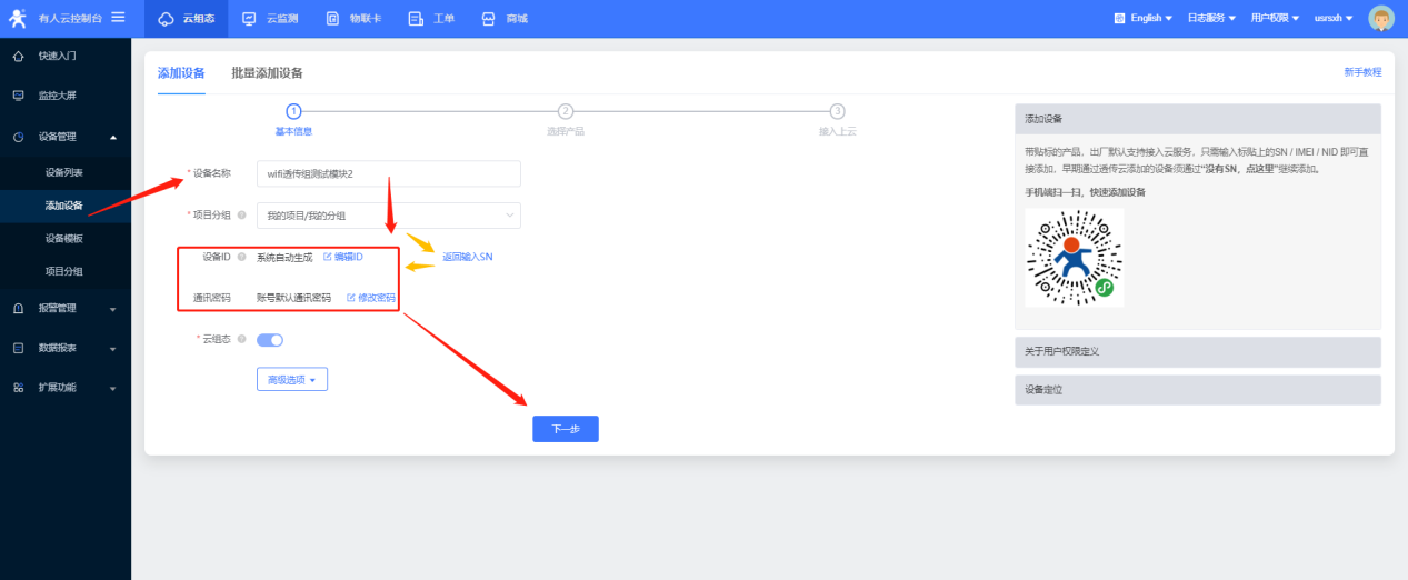 9、再次添加设备,名称设置“wifi透传组测试模块”,设备ID与通信密码自动生成后点击“下一步”后,选择“数据透传”,确认添加。