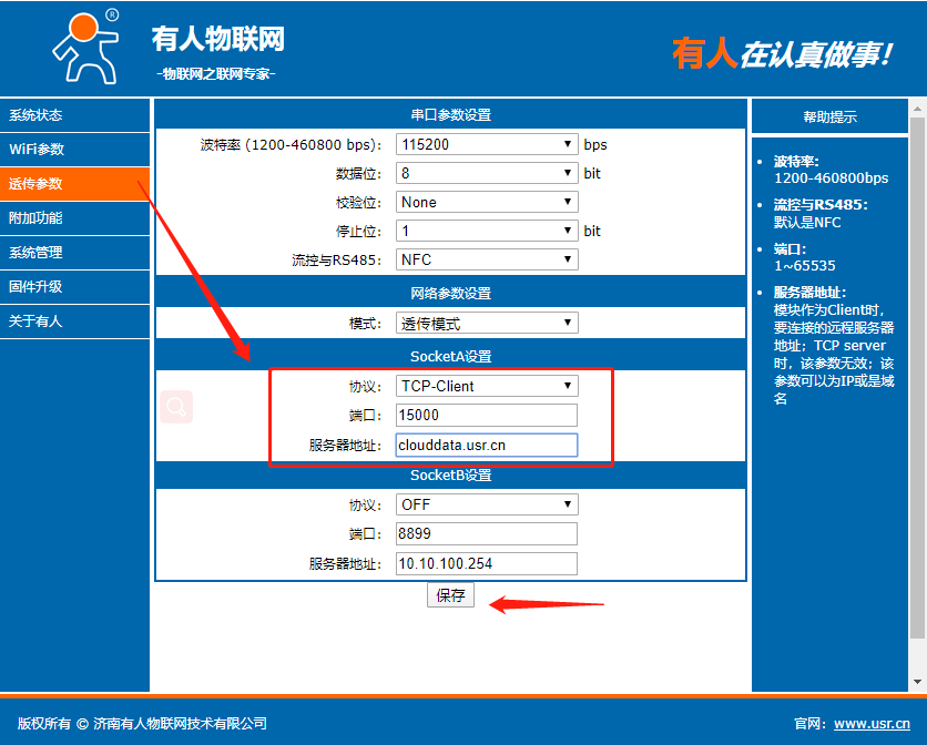 13、进入到“透传参数”,串口参数设置为和您终端设备的串口参数一致。网络设置上设置为Tcp Client,透传云的域名为clouddata.usr.cn,透传云的端口为15000,设置完点击保存;