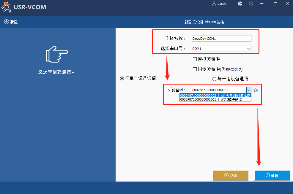 18、选择一个没有使用串口号,选择云端刚才添加的设备,点新建,生成设备对应的虚拟串口。