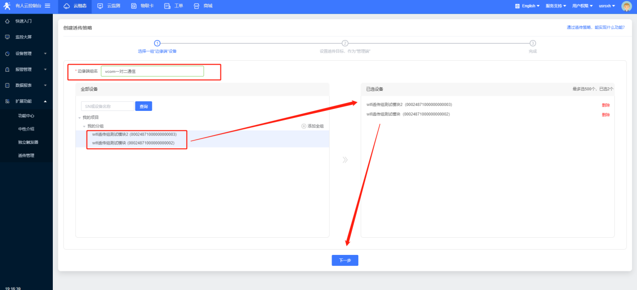 20、自定义边缘端名称,选择刚刚添加的两个wifi模块,点击下一步。