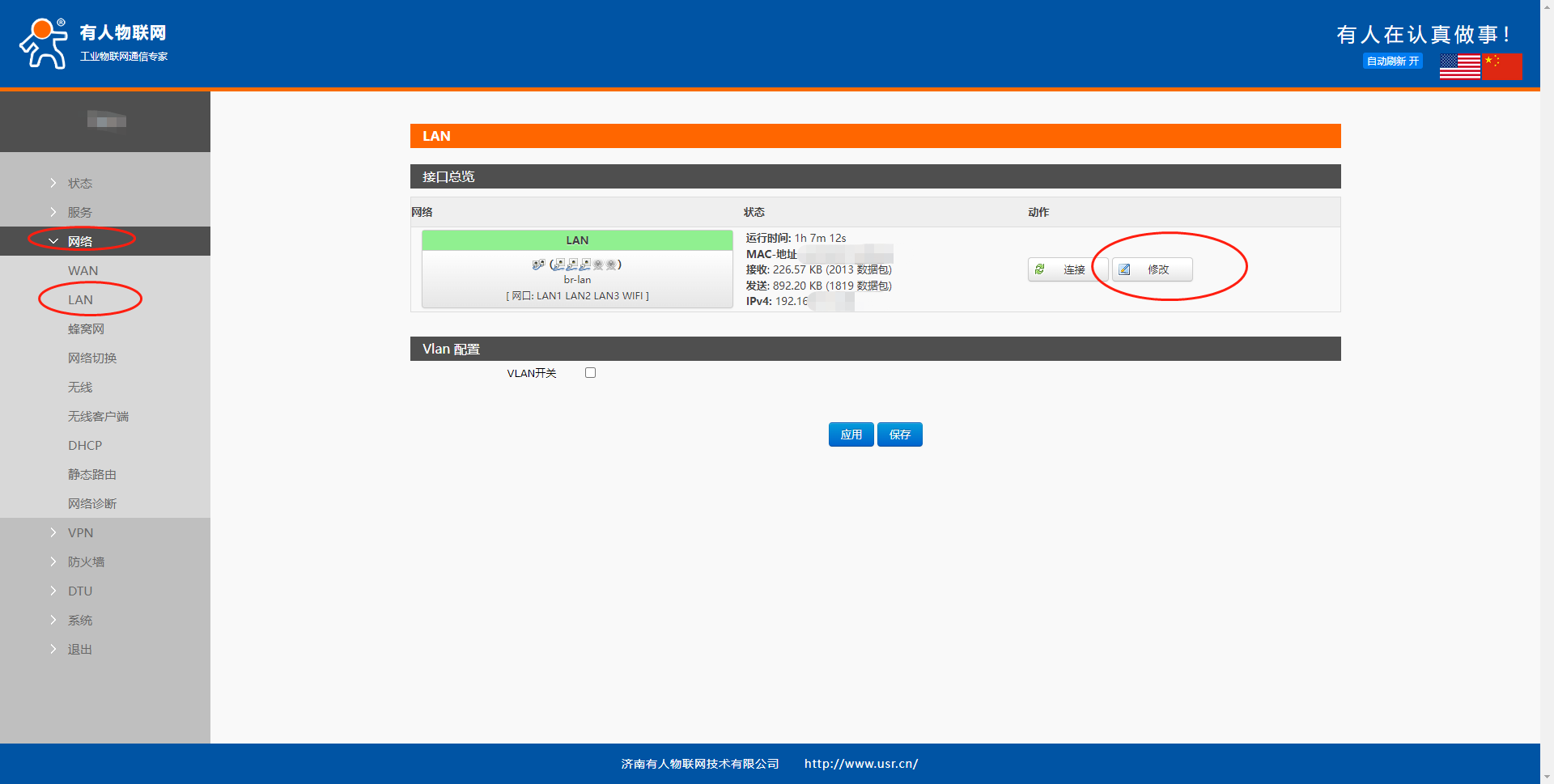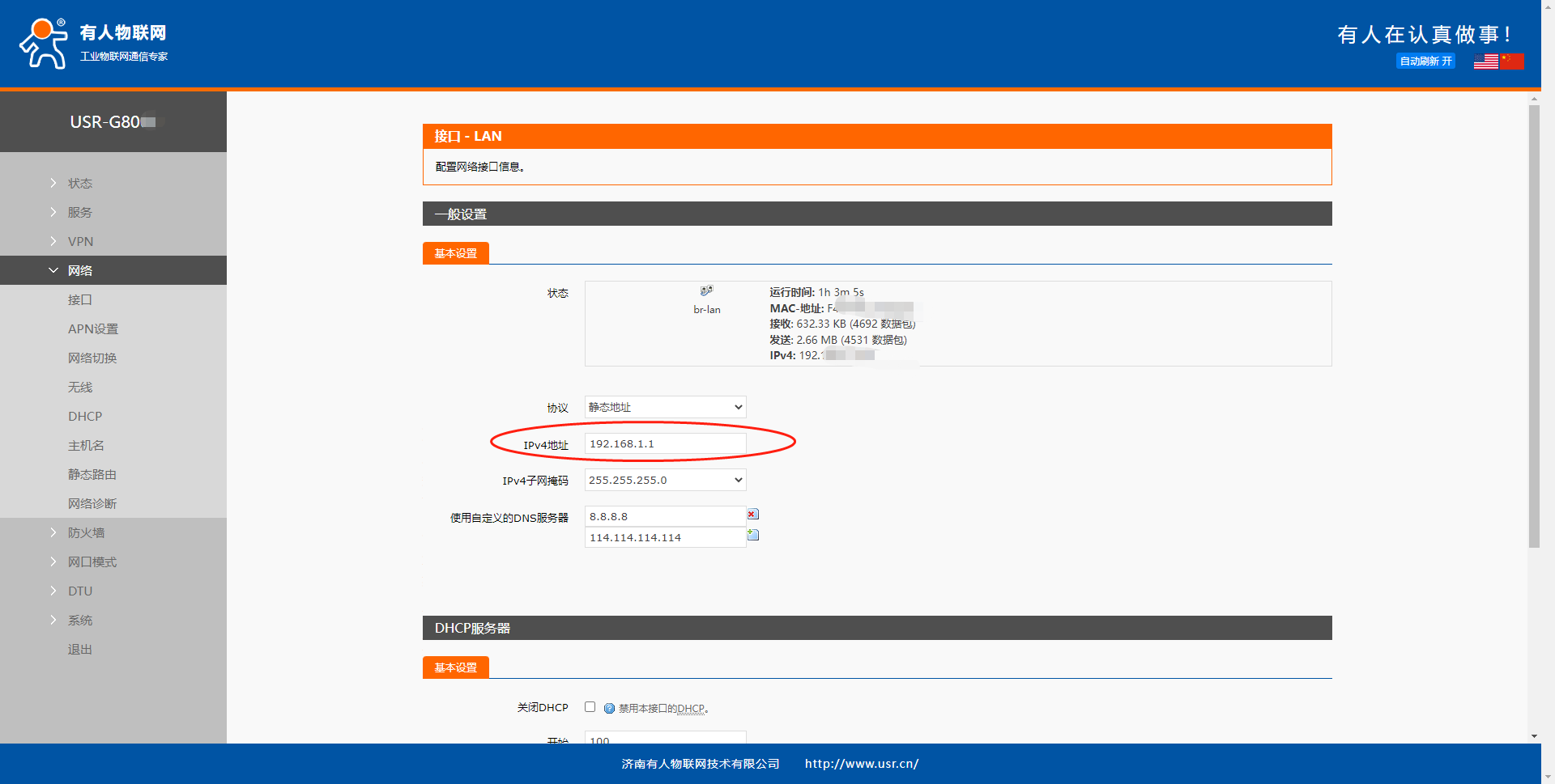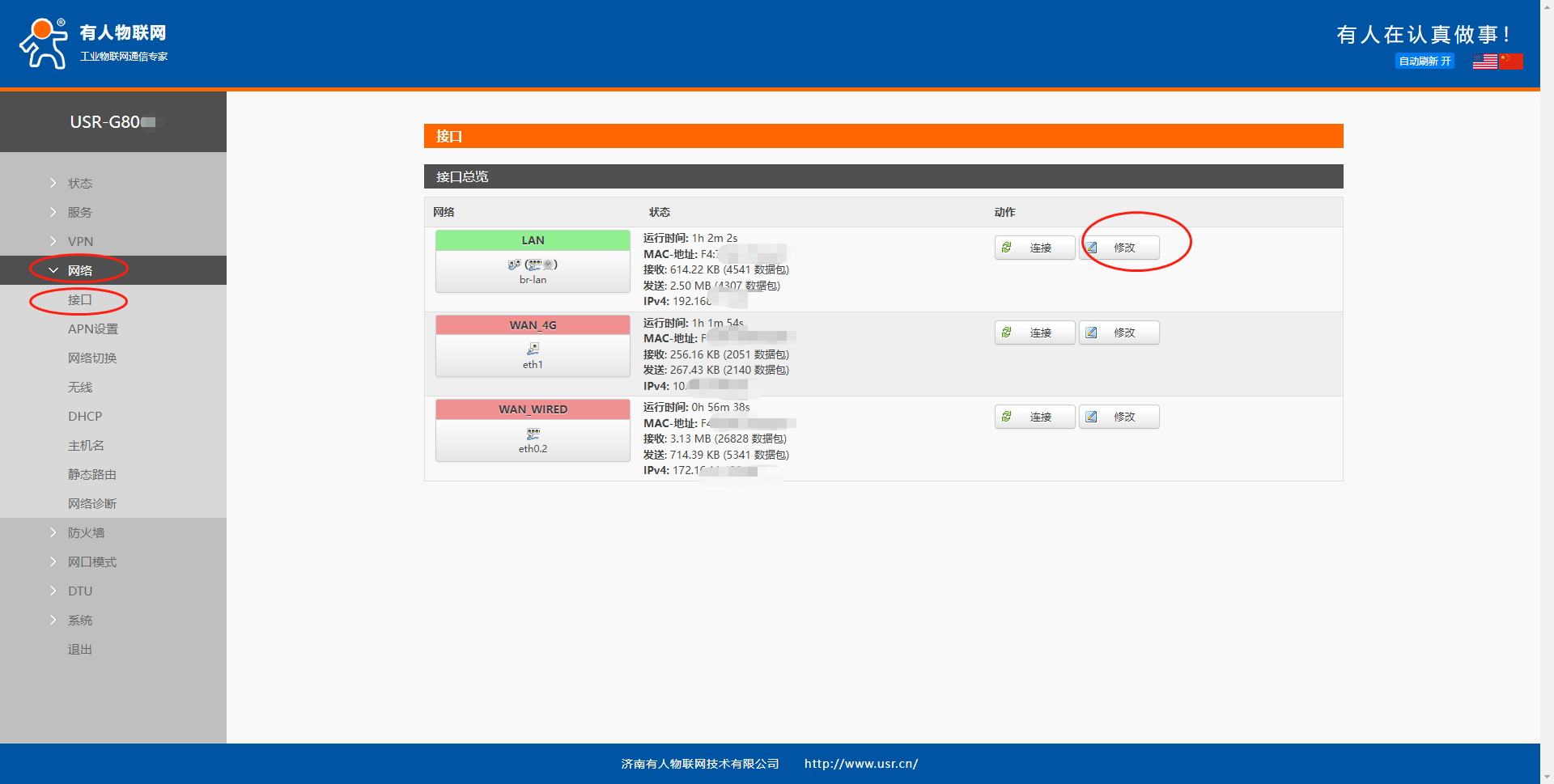 G80x(包括G806、G806s等以及G810)系列:网络--接口--修改--IPV4地址--保存&应用