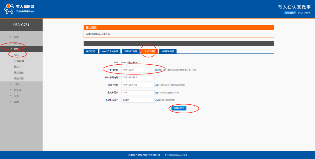 G781:网络--接口--LAN口设置--IPV4地址--保存&应用