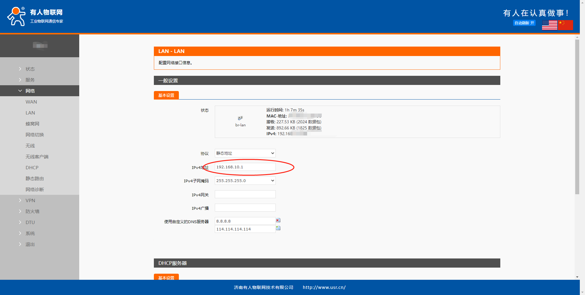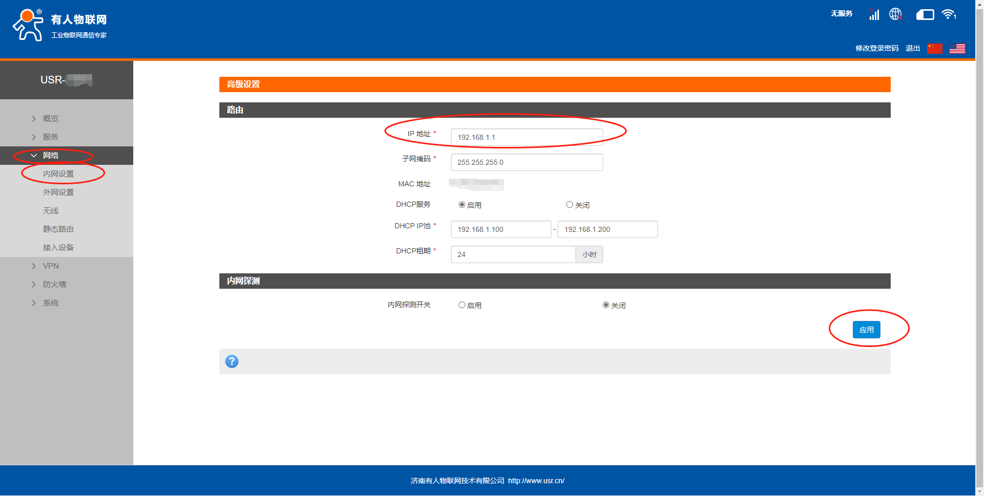 G805(包括RM02、RM03、DR801)系列:网络--内网设置--IP地址--应用