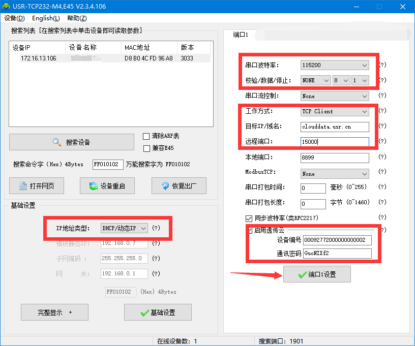 4.设置参数:将工作方式 ,远程服务器地址和远程端口分别设置为:Tcp Client、clouddata.usr.cn、15000;