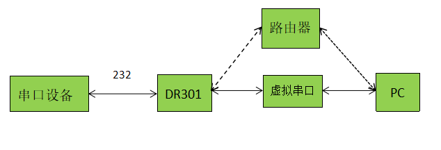1、将301(USR-DR301,简称301)的串口通过串口线(或USB 转串口线)与pC相连接,通过网线将串口服务器DR301的网口pC的网口相连接,检测硬件连接无错误后,接入我们配送的电源适配器,给301供电。