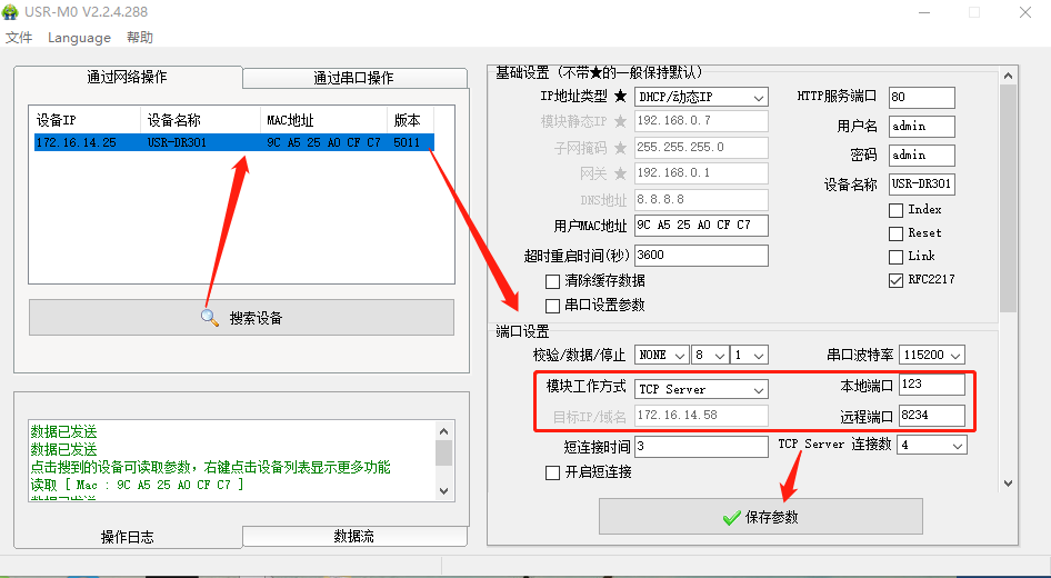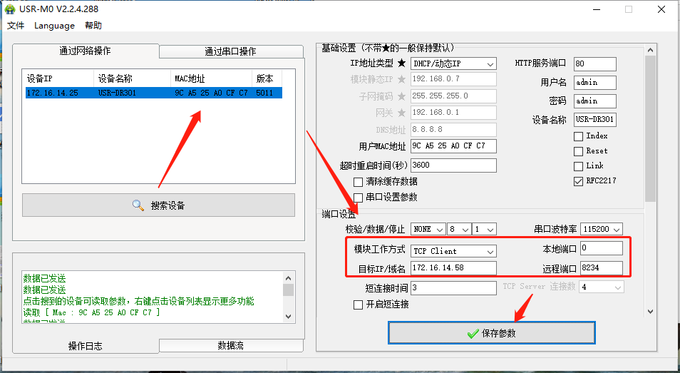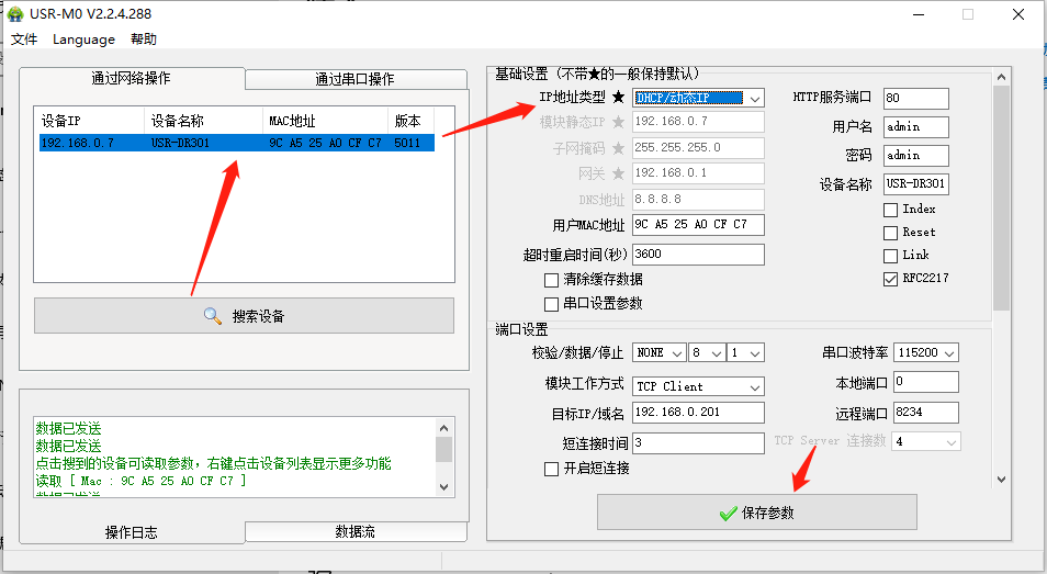 点击“搜索设备”当搜索列表中出现301的设备后,单击搜索到的设备,右边基础设置,在“Ip地址类型”将静态Ip改为DHCp动态获取,点击保存参数。
