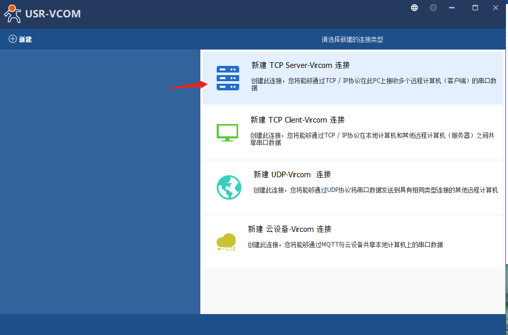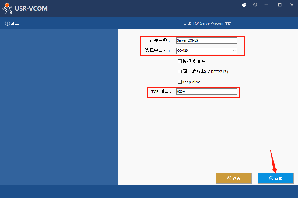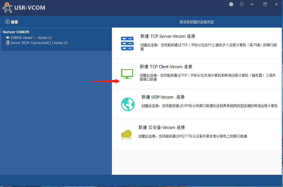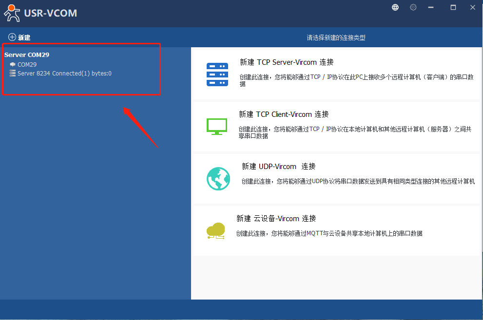 6、打开虚拟串口软件,点击“新建TCpServer-Vircom连接”,选择新的串口号(为了避免串口冲突,尽量往大选),此处以COM29为例,TCp端口设为8234,点击新建,可以看到自己刚刚创建的虚拟串口。