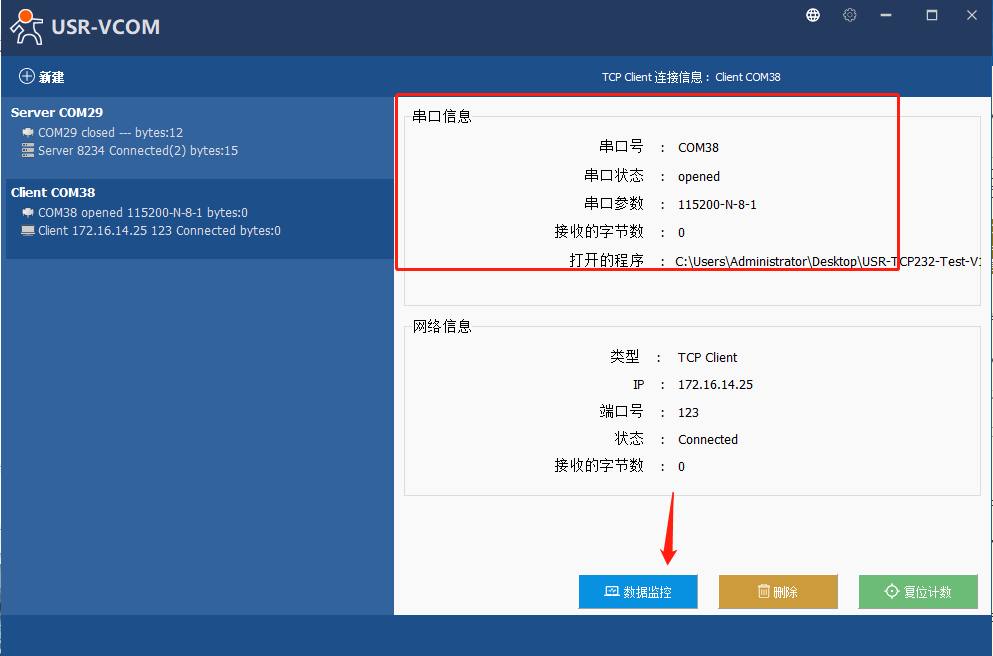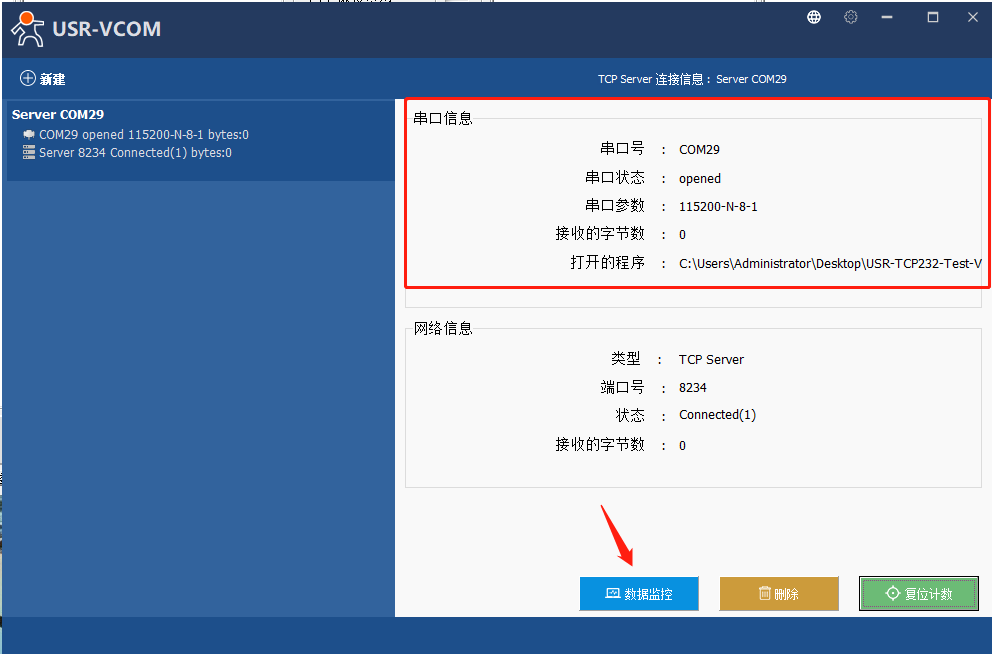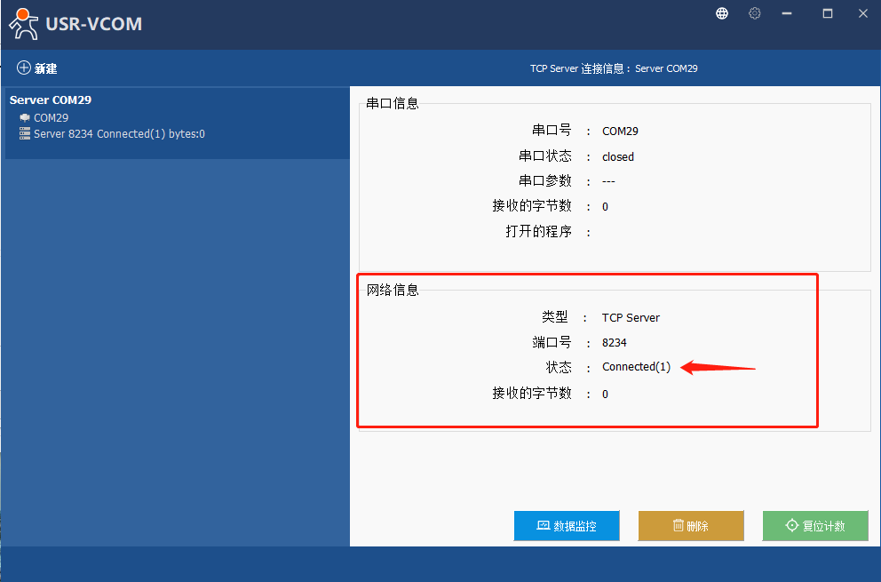 7、点击新建立的虚拟串口,可以看到网络信息状态显示Connected(1),代表已经建立连接。