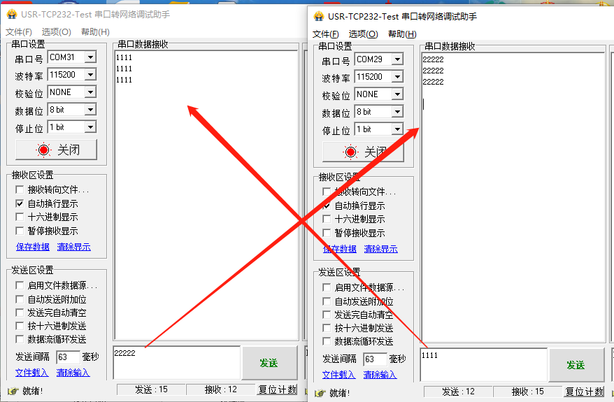 13、打开两个串口调试助手软件,串口端选择正确的串口(设备插在电脑上所识别到的COM口可在设备管理器--端口处查看)以及串口参数,301出厂默认115200,N,8,1。打开创建的虚拟串口后,虚拟串口界面显示串口信息为:Opened。