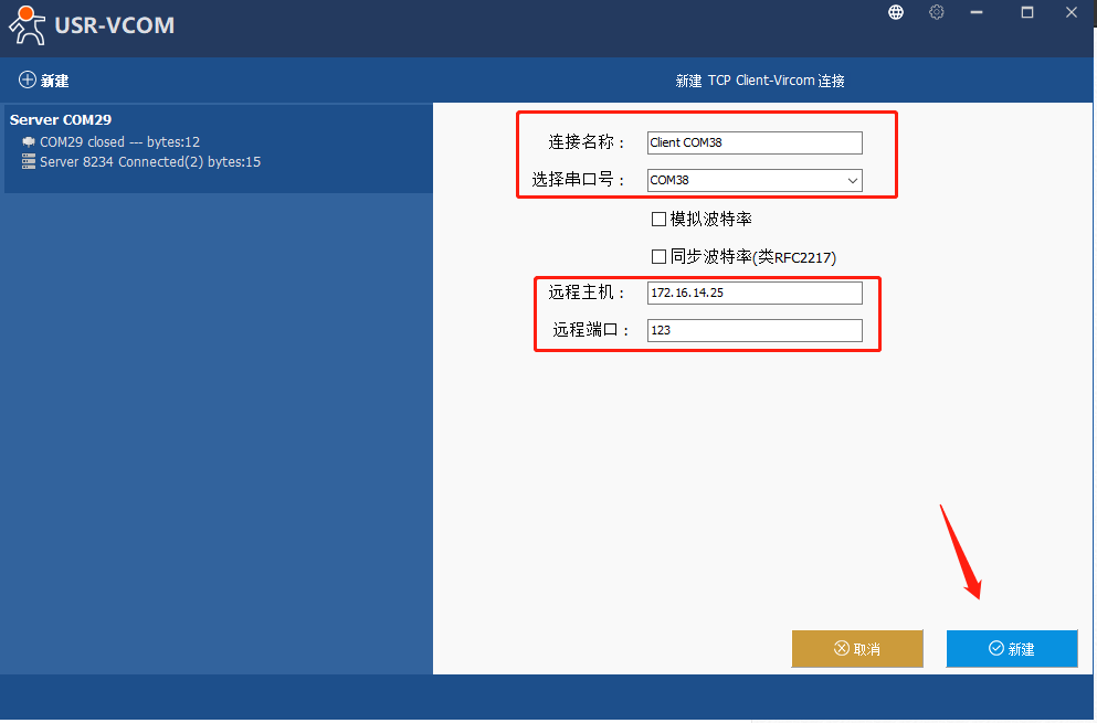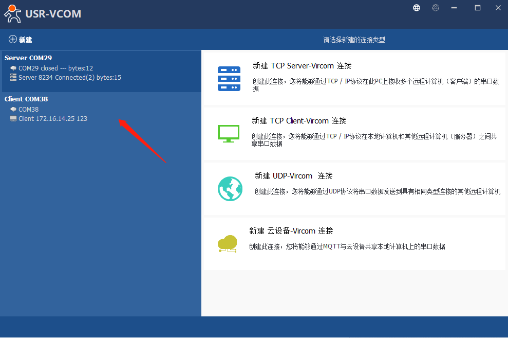11、打开虚拟串口软件,点击“新建TCp Client-Vircom连接”,选择新的串口号(为了避免串口冲突,尽量往大选),此处以COM38为例,远程主机:172.16.14.25(路由器分配给301的Ip),远程端口设为123,点击新建,可以看到自己刚刚创建的虚拟串口。