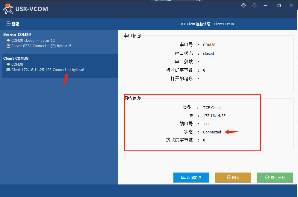 12、点击新建立的虚拟串口,可以看到网络信息状态显示Connected,代表已经建立连接。