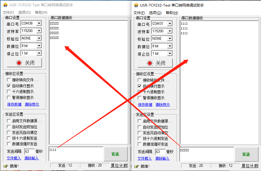 8、打开两个串口调试助手软件,串口端选择正确的串口(设备插在电脑上所识别到的COM口可在设备管理器--端口处查看)以及串口参数,301出厂默认115200,N,8,1。打开创建的虚拟串口后,虚拟串口界面显示串口信息为:Opened。