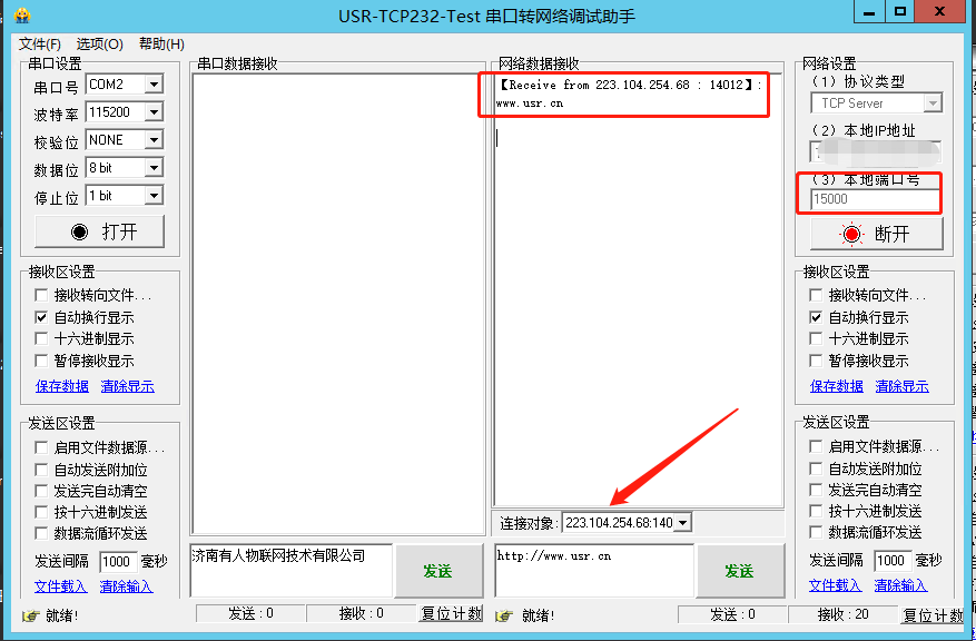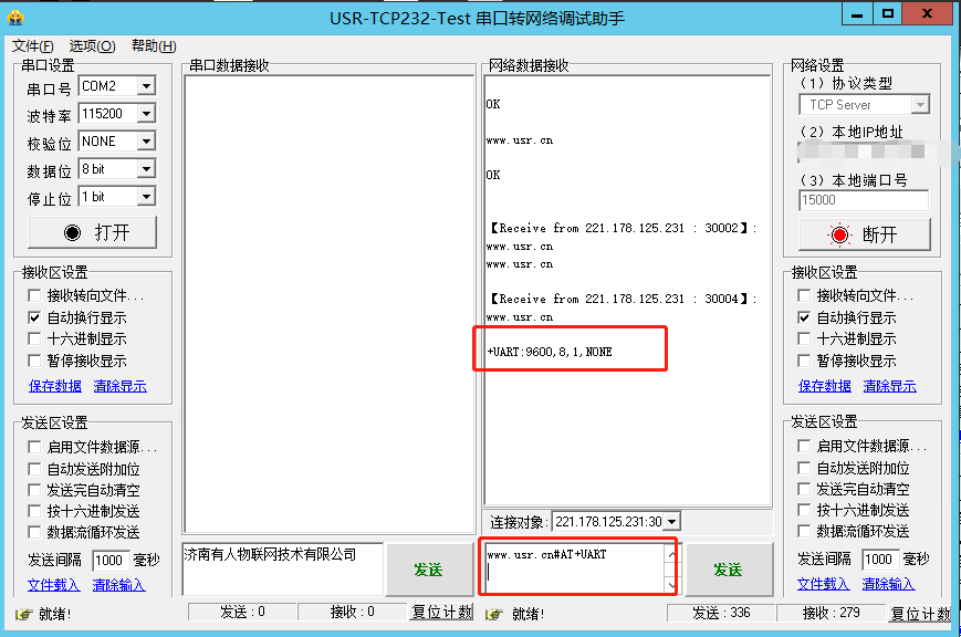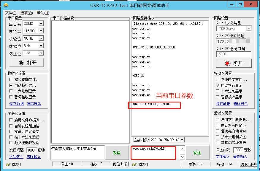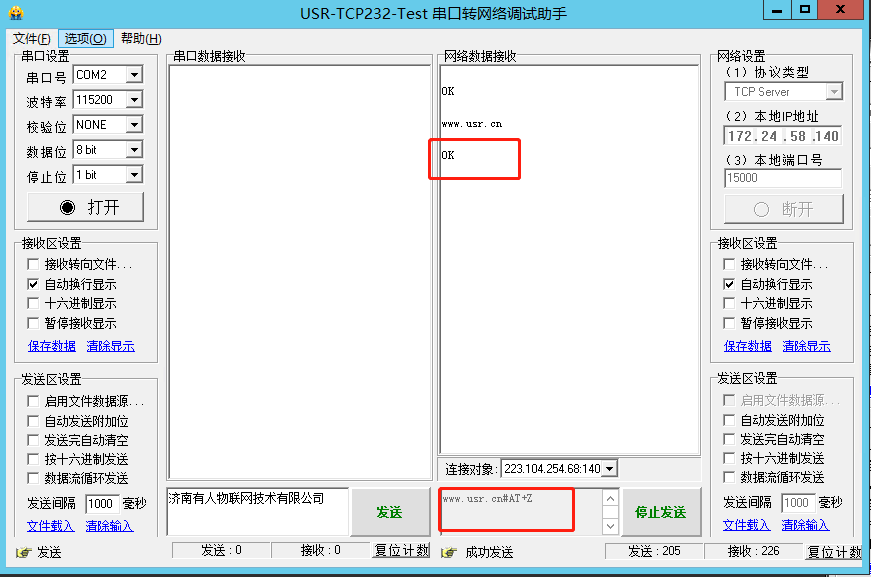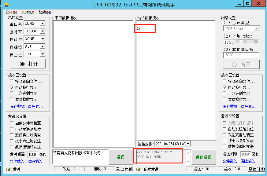 网络AT指令格式:命令密码+AT指令(7S5命令密码默认是www.usr.cn#;指令需要加回车换行)