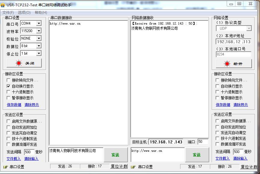 在电脑下载,并安装打开USR-TCP232-TEST 串口网络助手。建立UDP连接,USB-RS485线接第一个电脑,就可以实现304串口和网络之间数据传输。
