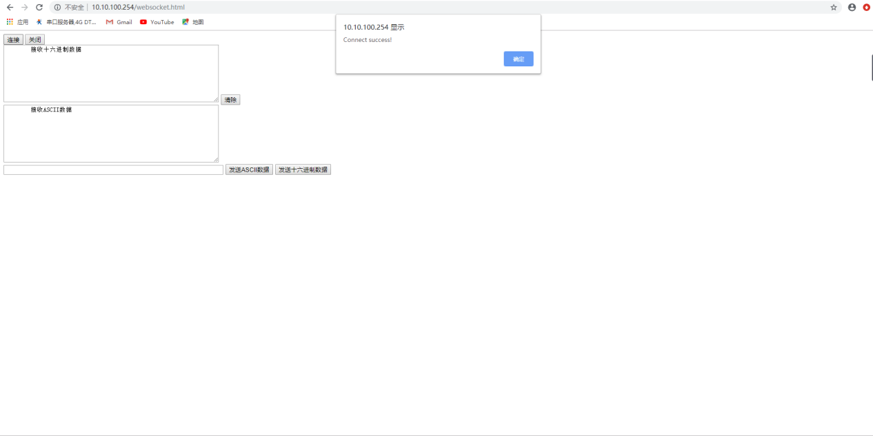 2.浏览器输入10.10.100.254/,进入websocket页面,点击连接,可以看到连接成功的提示