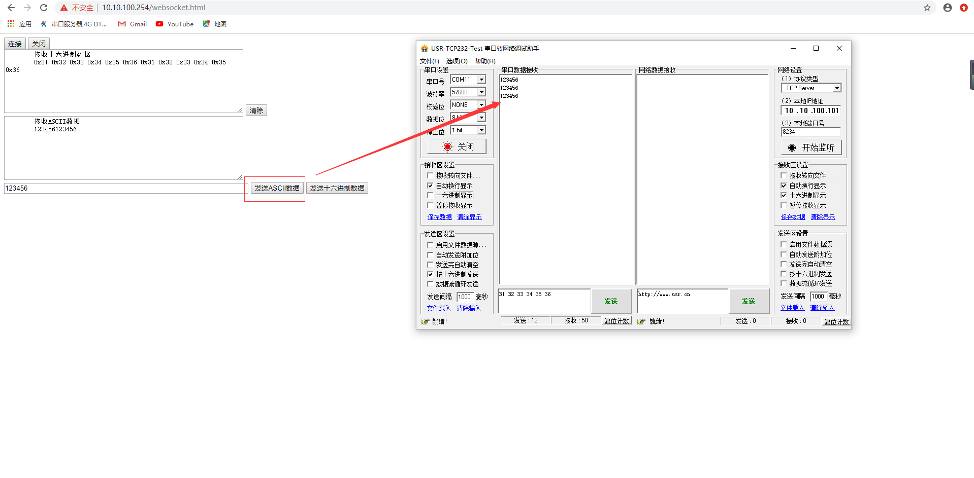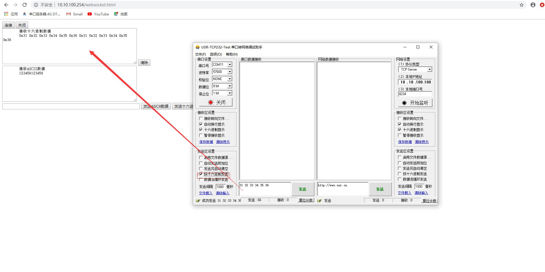 3.使用串口调试助手打开串口,串口参数和W630的内部串口参数设置一致,支持ASCII和十六进制发送和接收