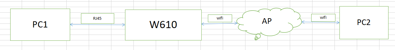 USR-W610(以下简称W610)接上供电电源,此时power指示灯亮起;将双网口wifi串口服务器W630的网口通过网线连接电脑(pC1),pC2先连接W610的wifi,进入内置网页配置参数,然后连接同一WiFi,和W610处于同一局域网
