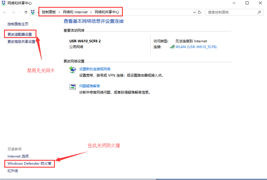 注意:在开始测试之前,一定要把电脑上的防火墙关闭,退出杀毒软件;在适配器设置中禁用本地网卡、VpN、虚拟机以及其他的网络设备