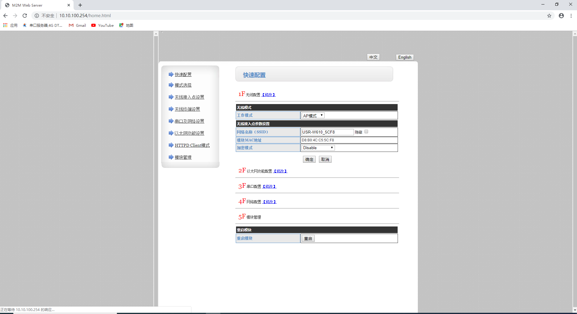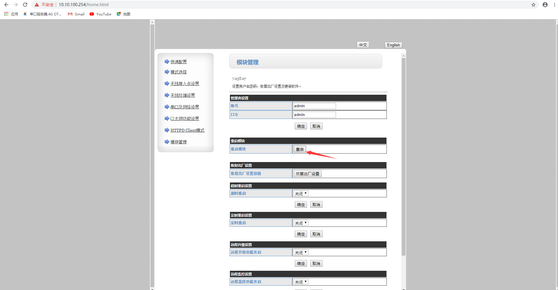 2.浏览器输入10.10.100.254进入内置网页,登录的账号和密码是admin和admin