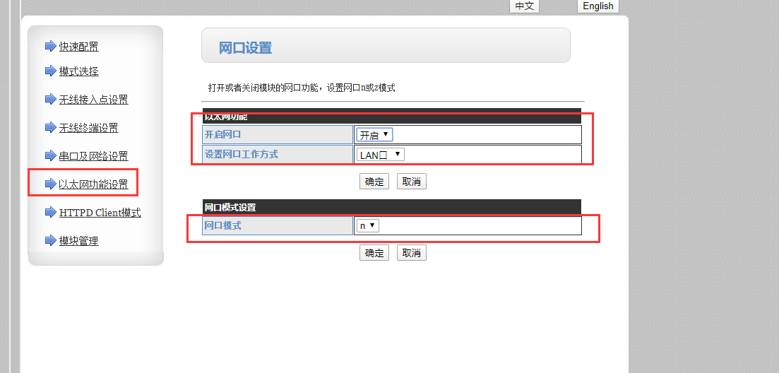 5.以太网功能设置:开启网口,选择LAN口,点击确定,网口模式选择路由(n),点击确定