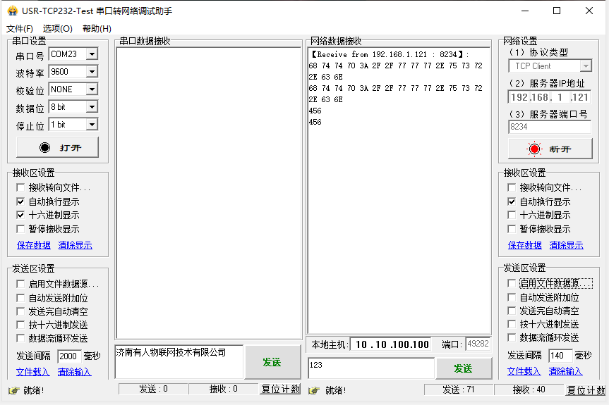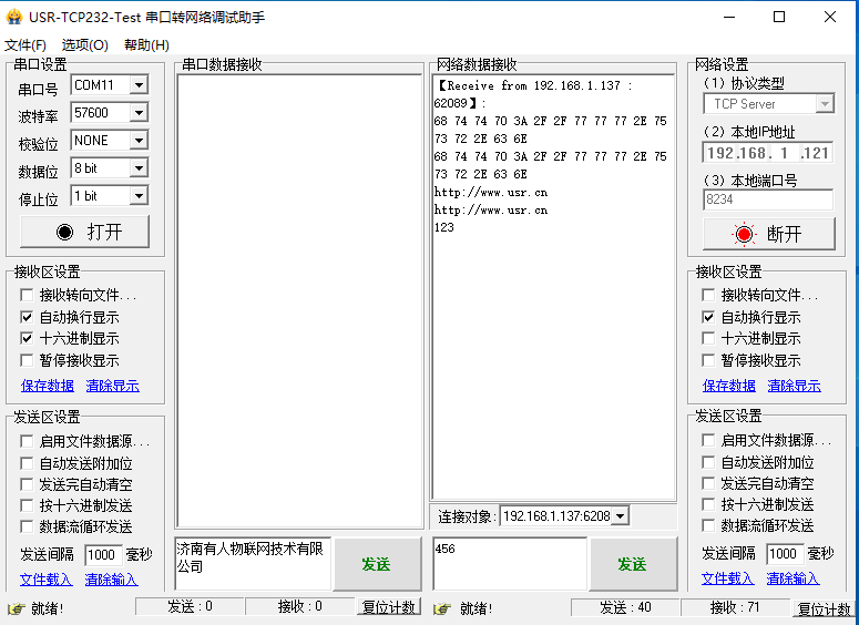 USR-W610基本通讯测试http://www.usr.cn/Faq/338.html
