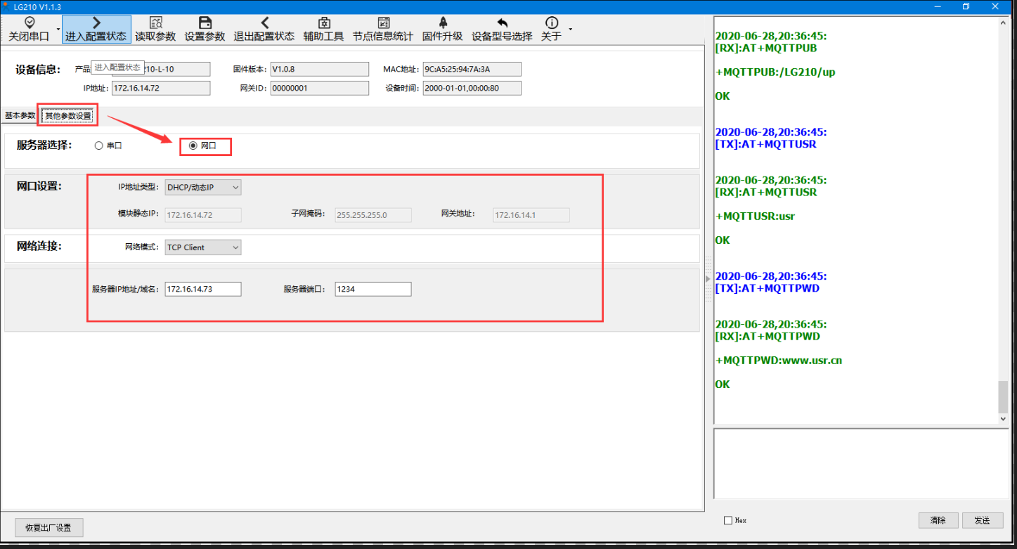 6) LG210配置完自动重启后,查看网络调试助手会显示有连接对象,连接对象Ip与LG210的Ip是一致的,说明LG210已连接成功。