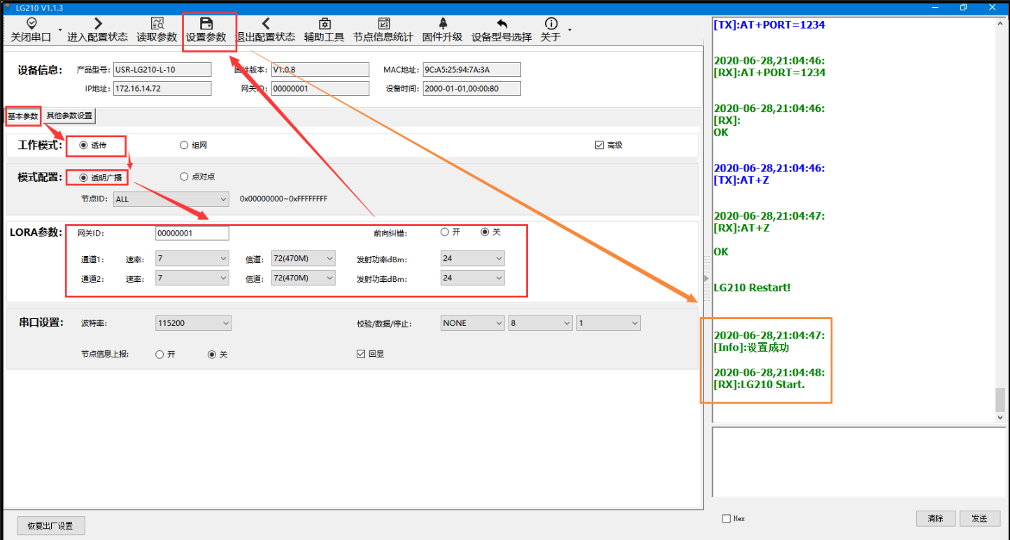 点击“读取参数”后, 将工作模式配置为“透传”,