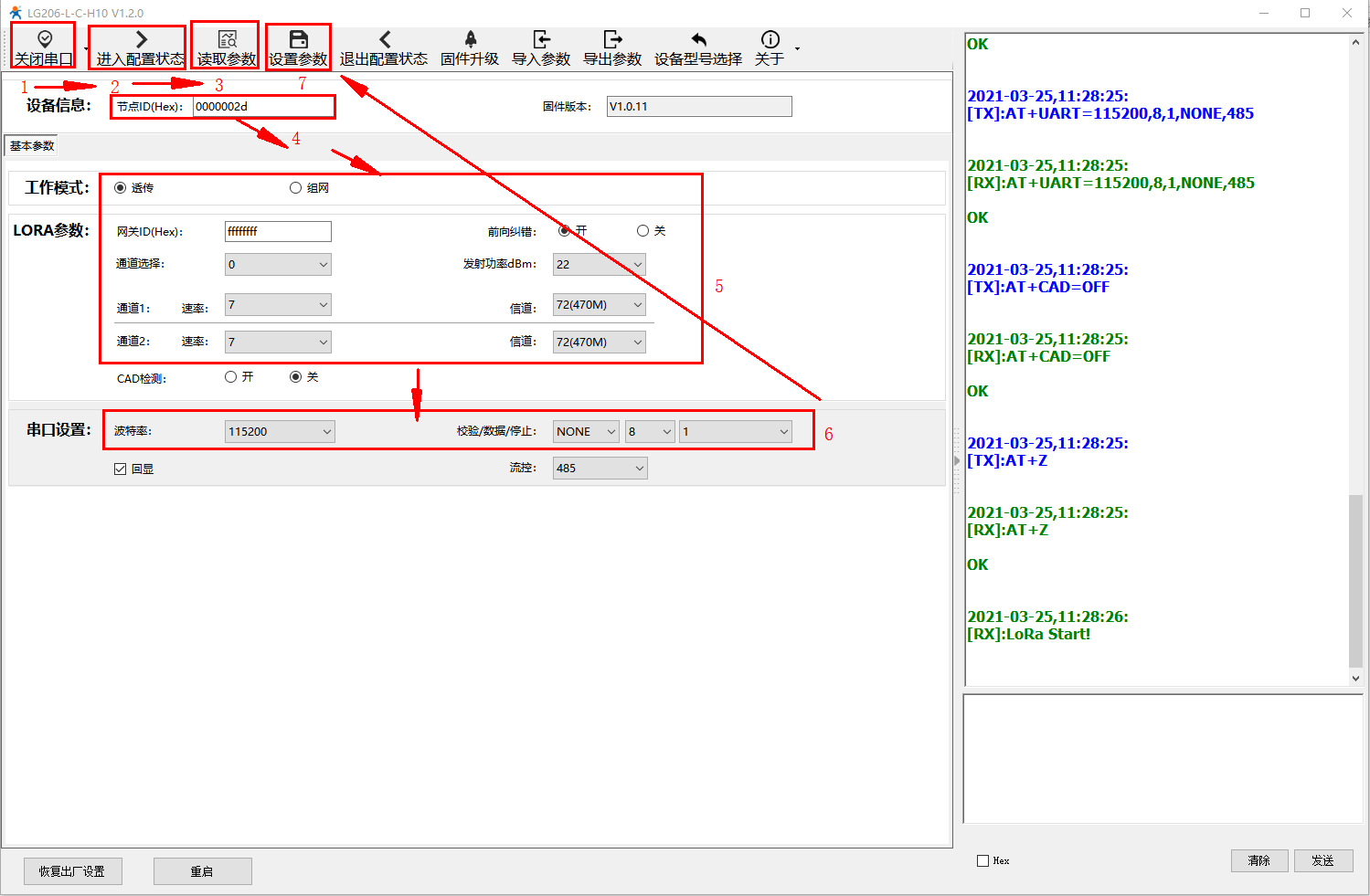 2) 打开设置软件(协议选择私有协议,型号选择LG210),依次点击打开串口(选择LG210对应的串口号,串口参数:115200,None,8,1,NFC)。