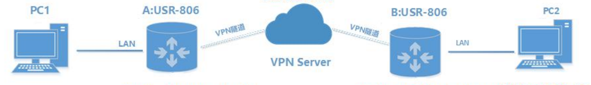测试环境,两个平级工业路由器 A 和 B,VPN 服务器, PC 两台,以 PPTP VPN 为例