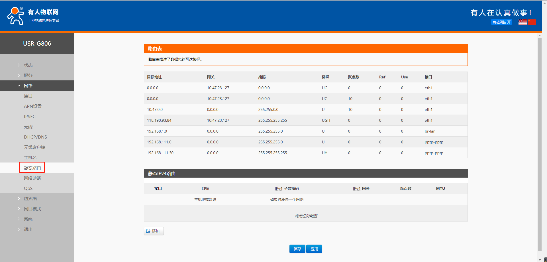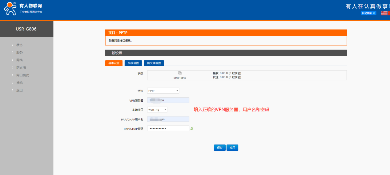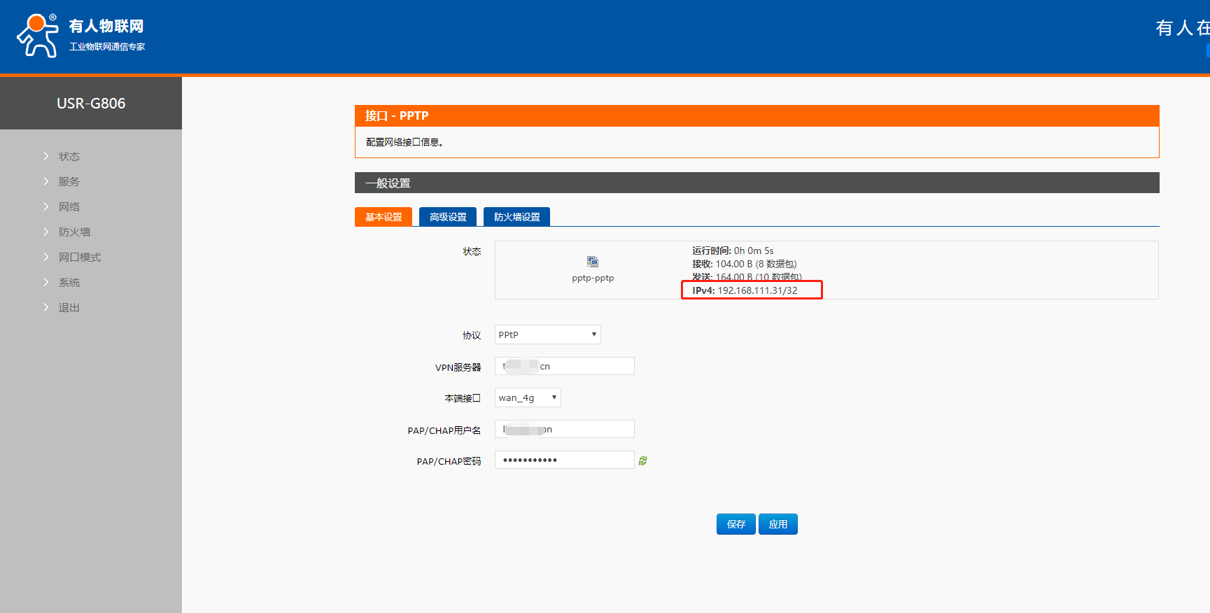 6. 设置参数无误,保存应用之后可以看到设备获取到的VPN IP。在接口pptp位置可以看到,也可以进入pptp这个接口查看。