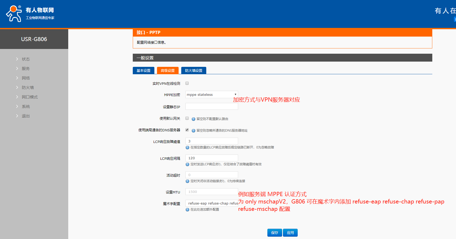 4、高级设置中加密方式与VPN服务器对应,其中加密方式可选:mppe stateful有状态连接:会进行频繁更换密钥,且在更换密钥时会出现严重丢包;mppe stateless无状态连接:只有在丢包的时候会进行密钥更改;no mppe服务端无 MPPE 加密方式时选择此模式。魔术字:当以上配置不满足配置文件和服务端向匹配时在此添加附加配置。例如服务端 MPPE 认证方式 为 only mschapV2,G806 可在魔术字内添加 refuse-eap refuse-chap refuse-pap refuse-mschap 配置