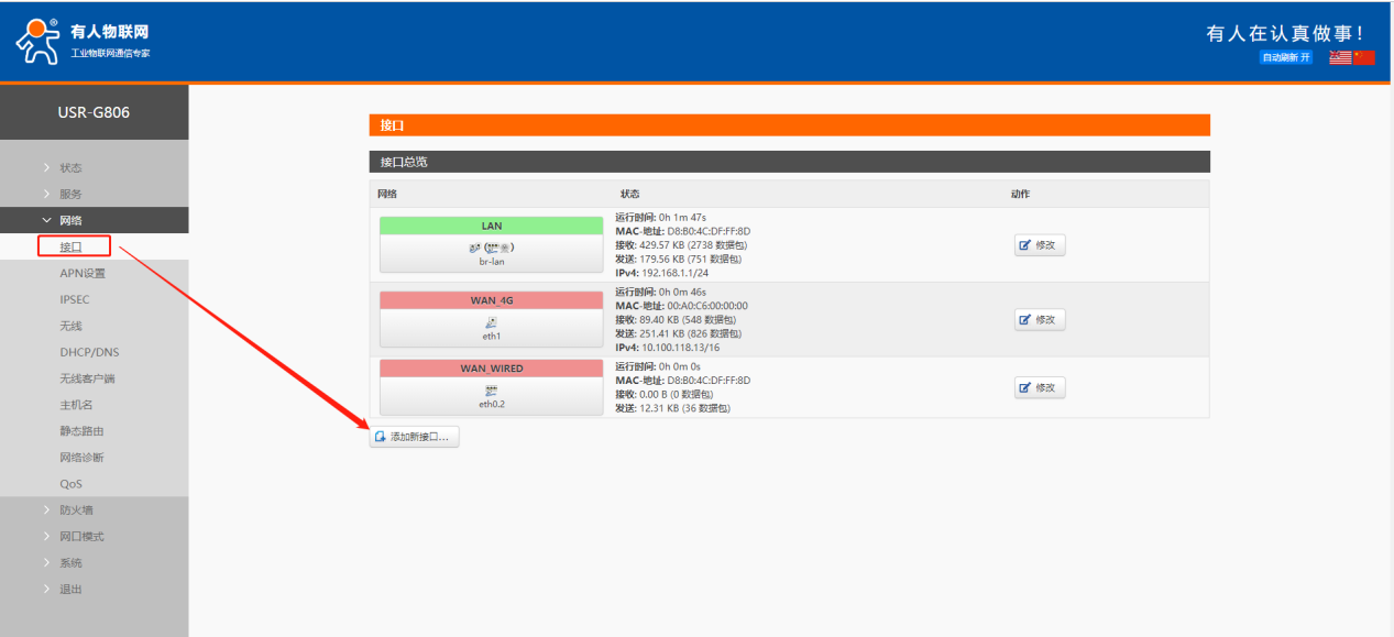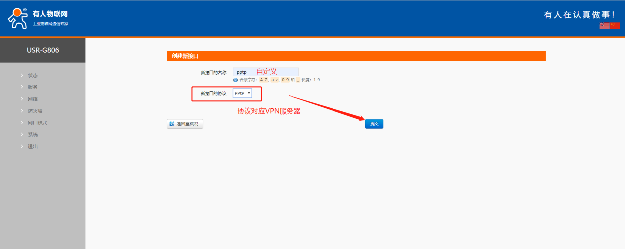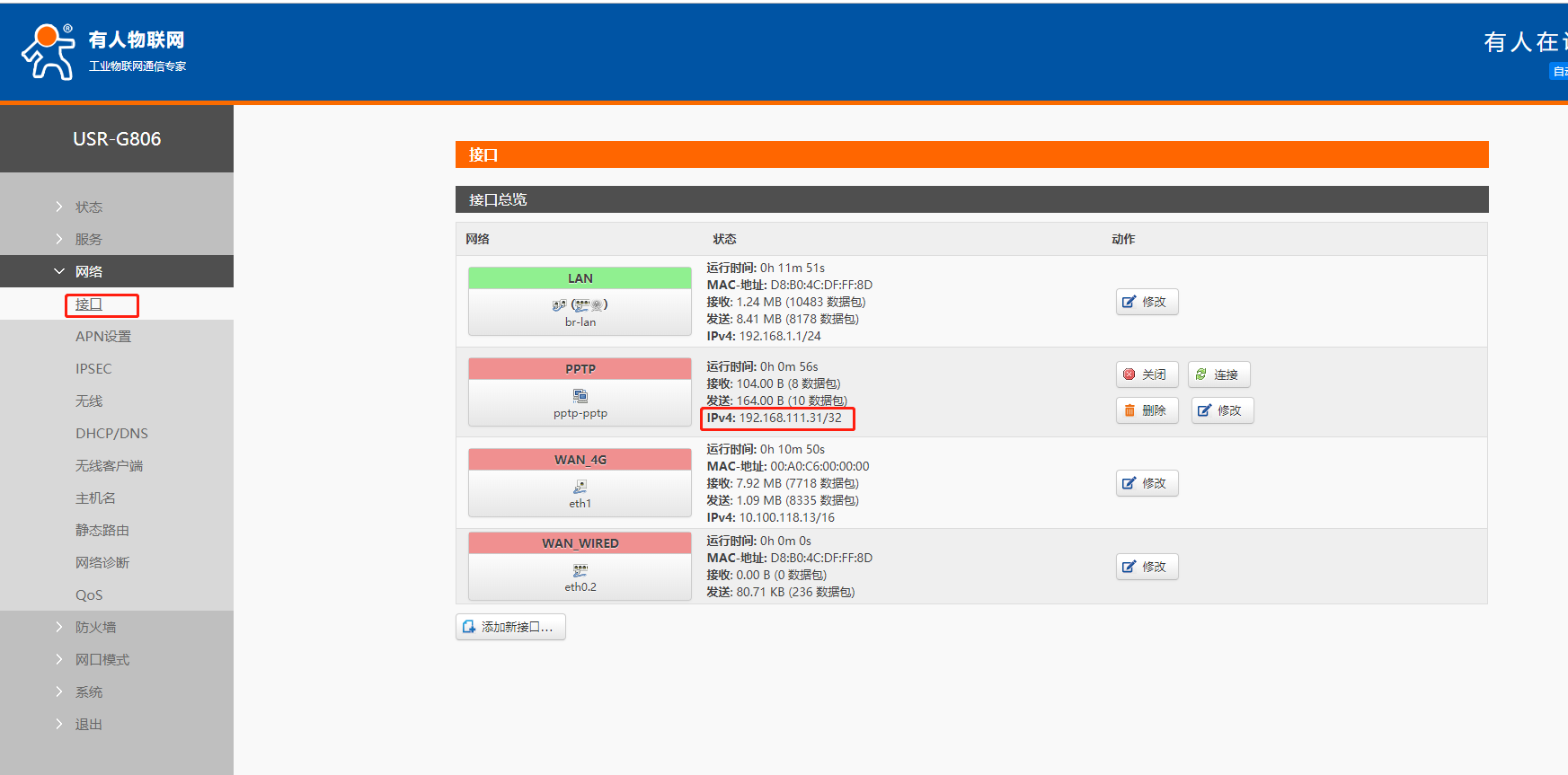 USR-G806:采用 4G 接口连接外网,创建 PPTP 接口连接 VPN;