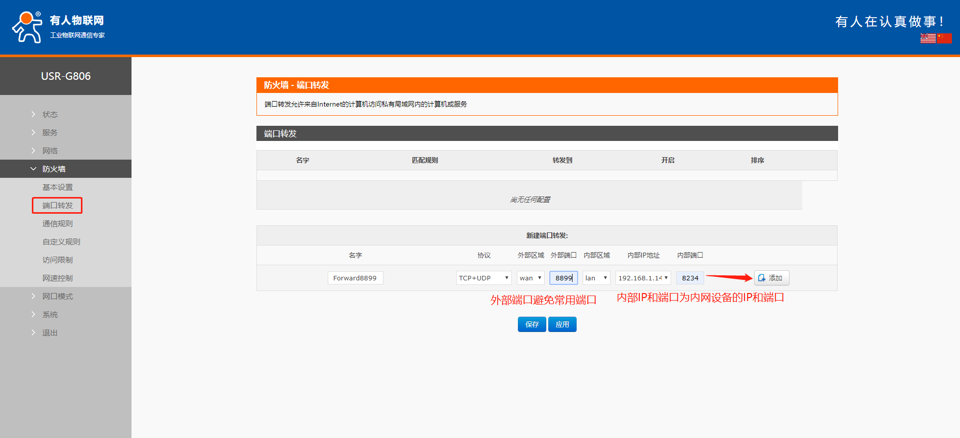 在内置网页防火墙,端口转发界面进行设置。内部IP和端口设置为内网设备的IP和端口,外部端口设置要避免常用端口。