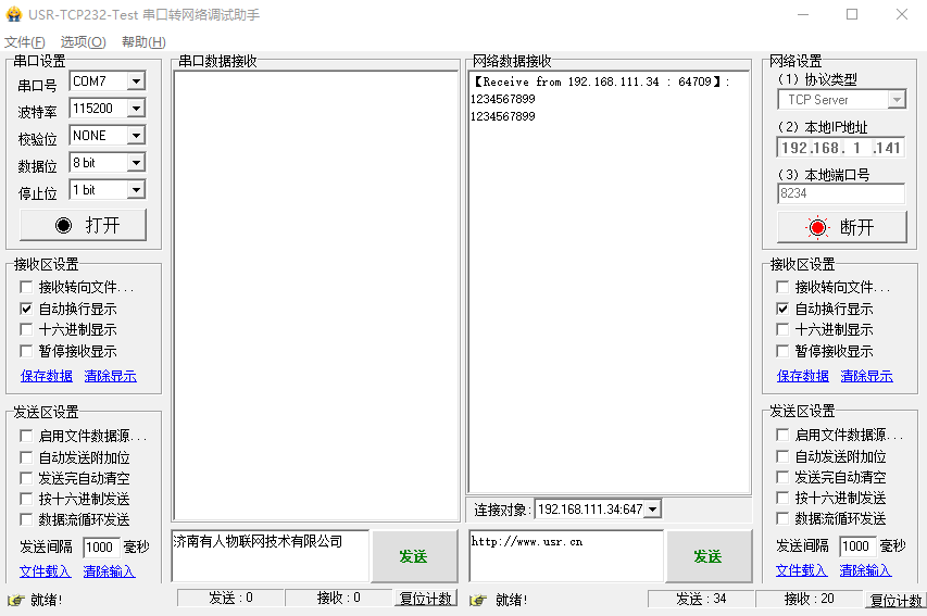 8、PC2也就是806的内网电脑打开一个串口调试助手,做tcp server,IP和端口为本身的IP和端口,开始监听。