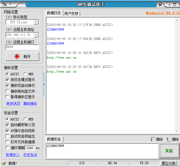 9、PC1即另一台直接连上VPN的电脑,打开网络调试助手,做tcp clinet端,IP设置806获取到的VPN IP,端口设置为端口转发的外部端口。能够连接到 4G 路由器下的 TCP Server 并进行通信。