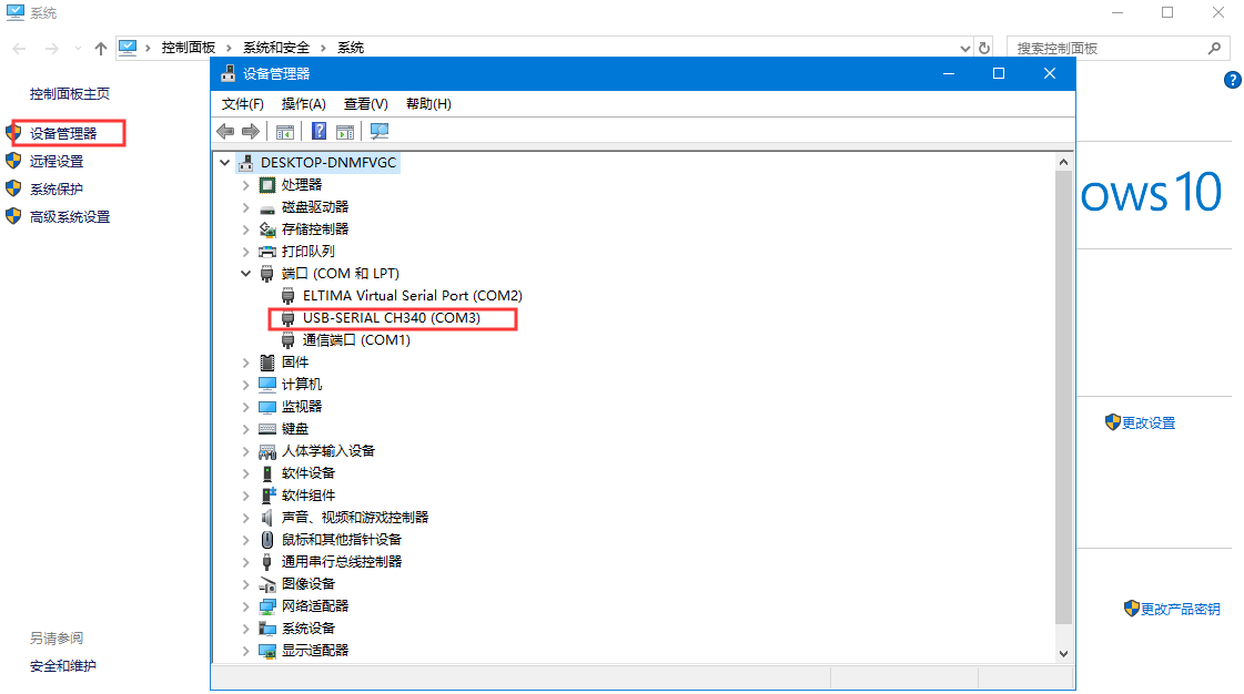 其中串口号可以在电脑的“设备管理器”中查看,见下图;
