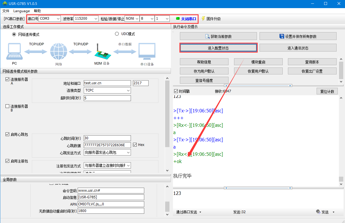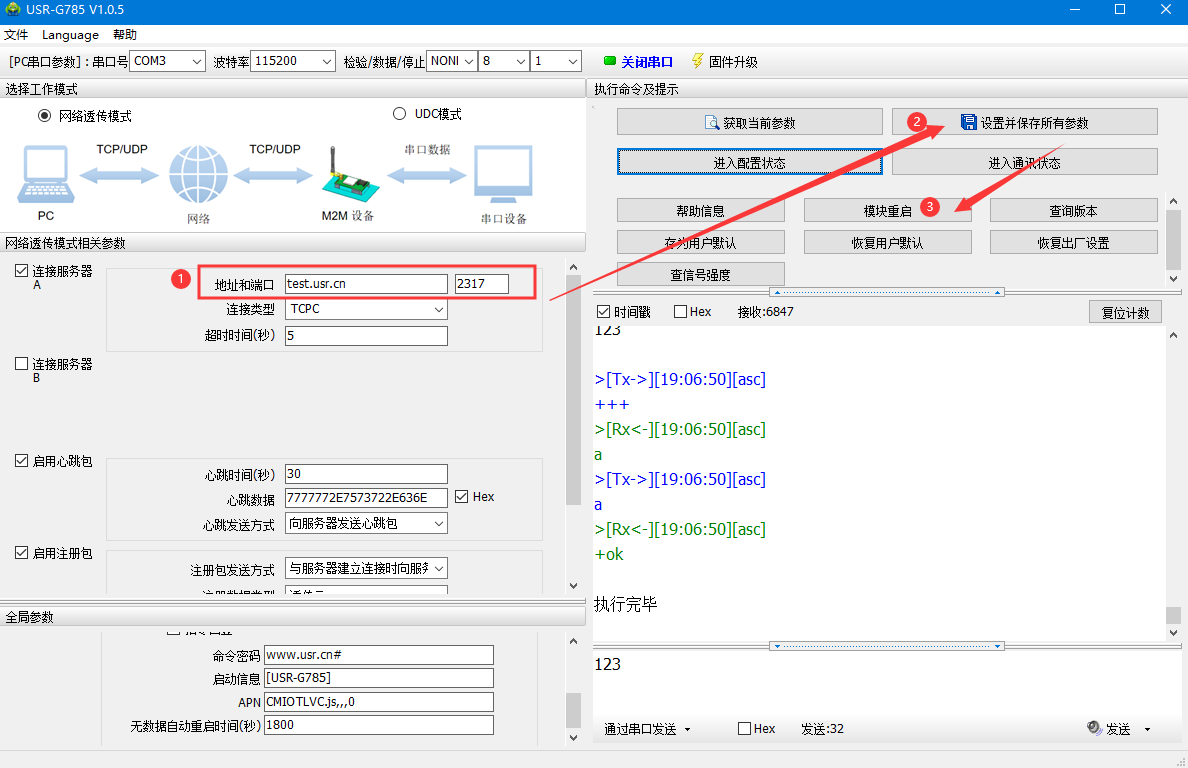 (1) 硬件连接:装上sim卡,接上天线,785的串口通过USB转RS232/485接到PC上,用我司提供的适配器供电。