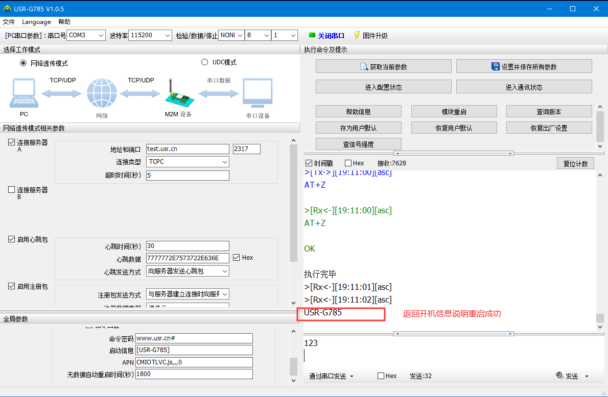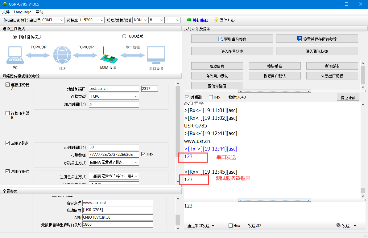 通过串口发送<123>,可以看到服务器返回了相同的内容,说明DTU工作是没有问题的