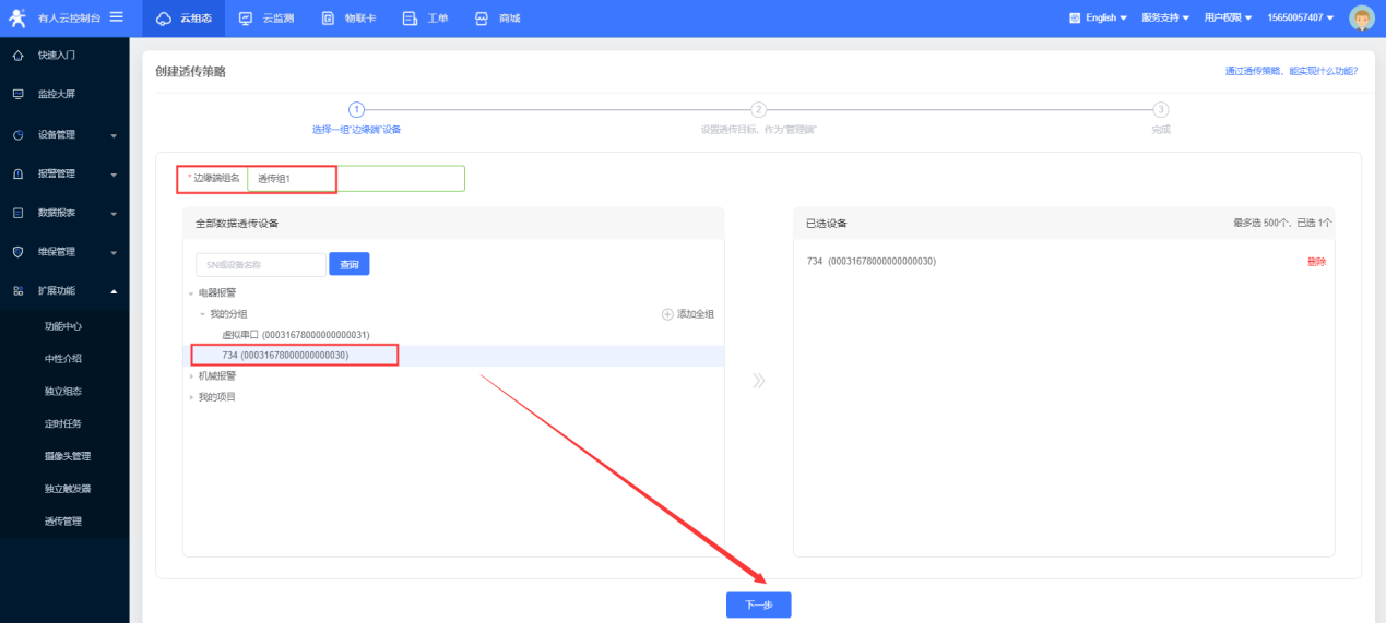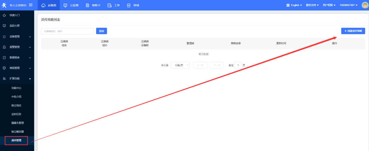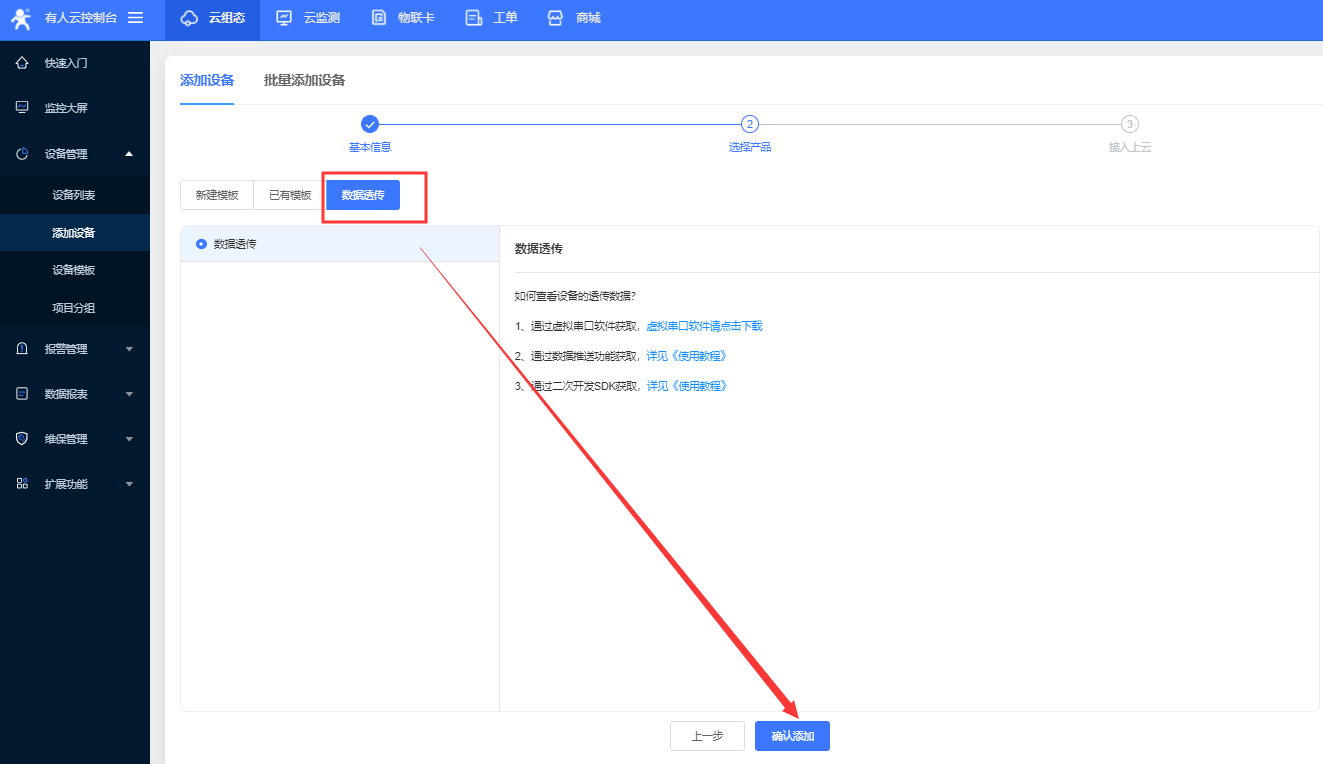 如果拓展功能中没有透传管理需要首先在功能中心开通此功能
