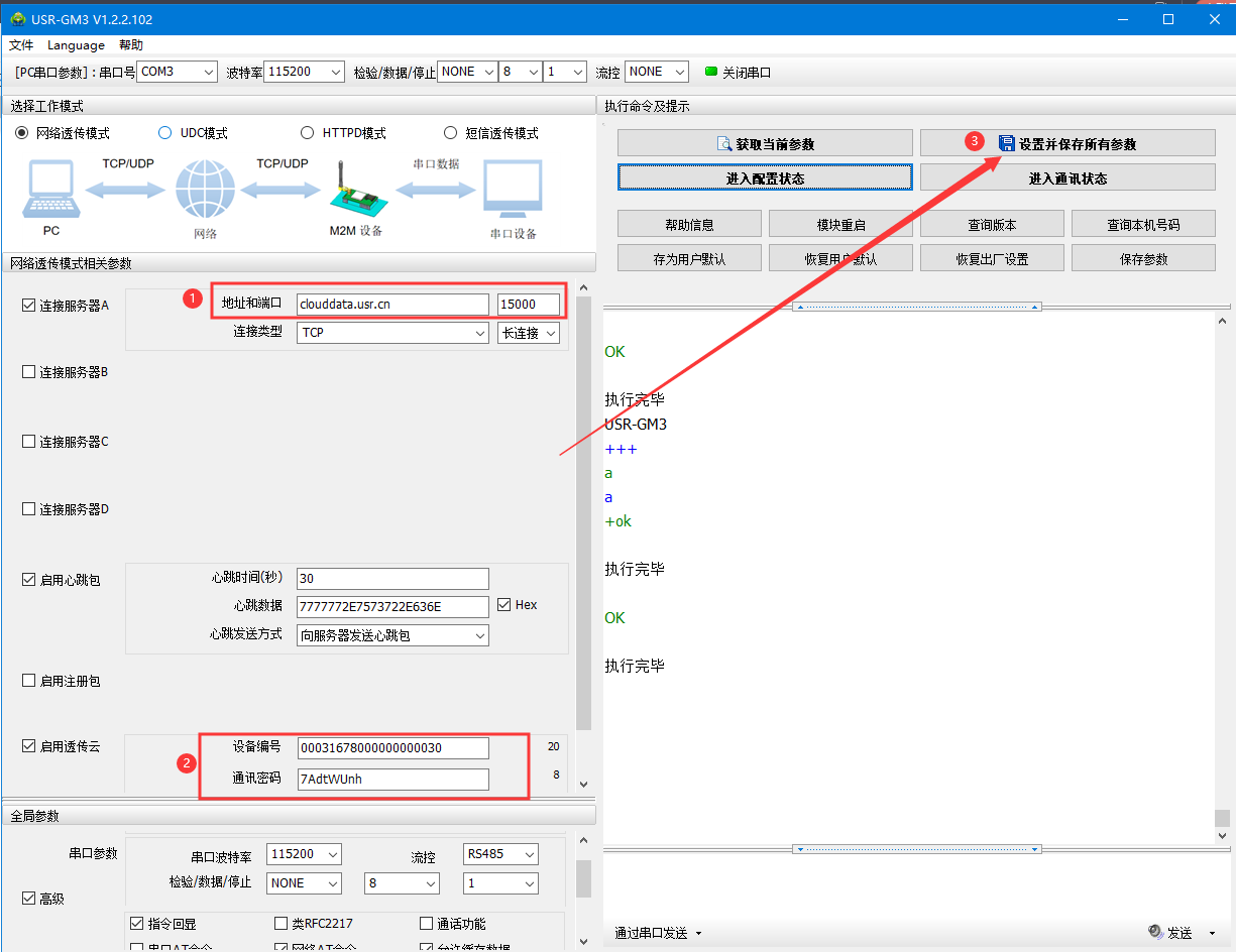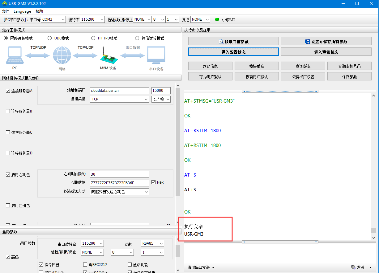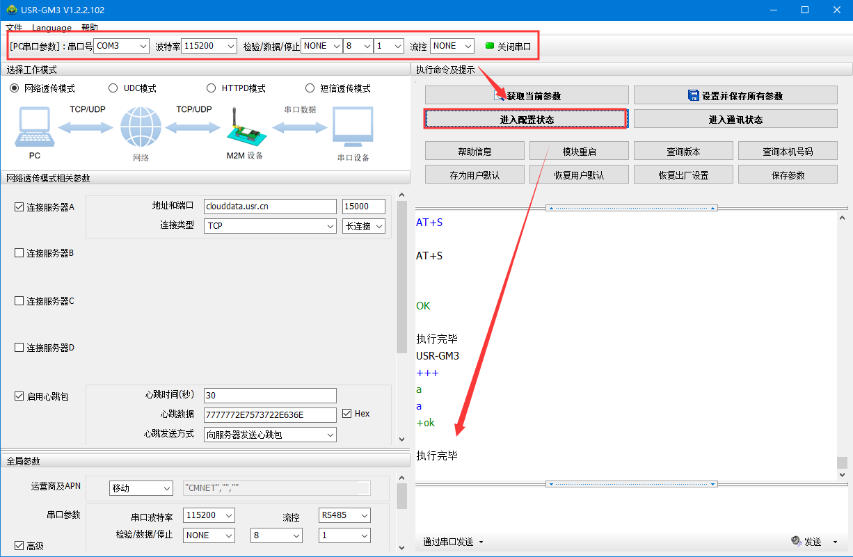 (2)默认串口参数115200 N 8 1,打开串口——进入配置状态——返回OK说明进入配置状态成功