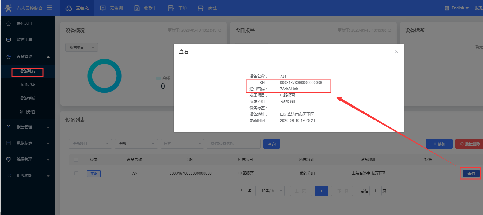(3)设置有人云的地址:clouddata.usr.cn 端口15000;在有人云查看设备编号和通讯密码,SN即设备编号,将SN和通讯密码分别复制到设备软件的设备编号和通讯密码;